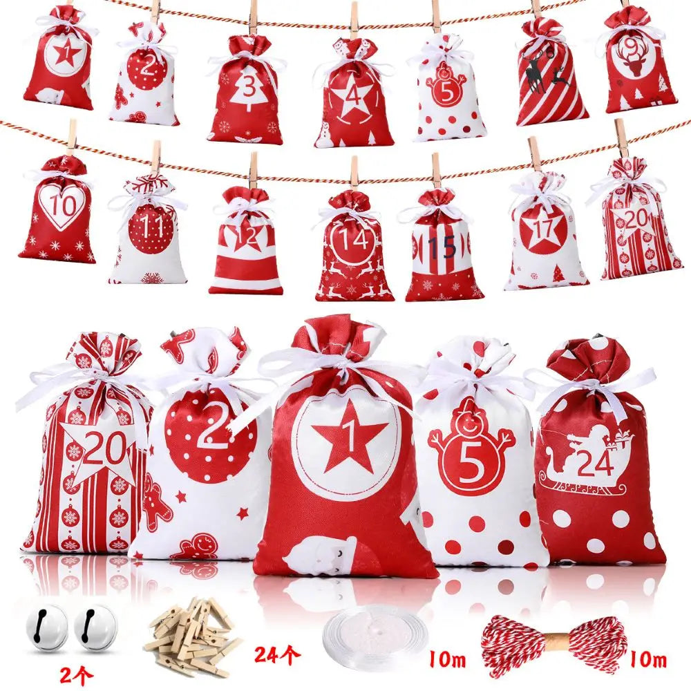 24pcs/set Red White Satin Christmas Drawstring Gift Bag for Kids Present Holiday Party Pouch Set Candy Packaging DIY Decorations
