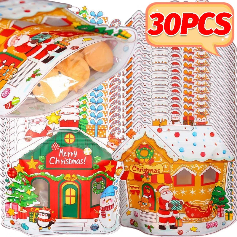 30/1x Wholesale Christmas Snow House Shape Candy Cookie Bags Santa Claus Snowman Gifts Packaging Bag for New Year Party Decor