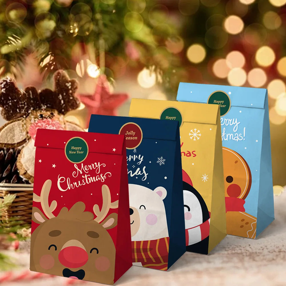 12pcs Merry Christmas Santa Claus Snowflakes Pattern Candy Gift Packaging Bags Happy Birthday Xmas Celebration Party Supplies