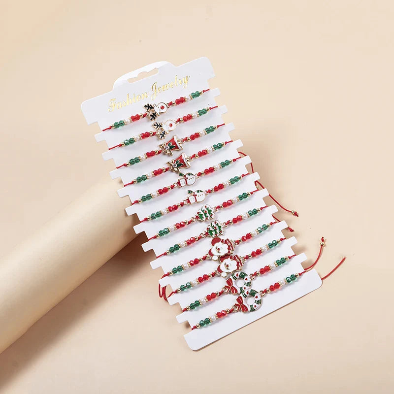 12PCS/SET Christmas Charm Bracelet Set Santa Claus Snowman Bells Elk Snowflake Rope Adjustable Bracelet for Women New Year Gift
