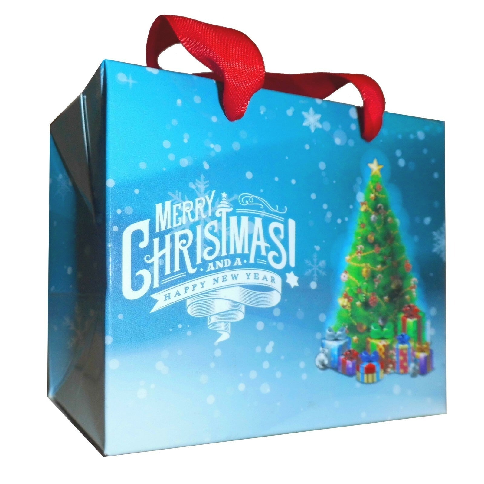 Pack of 10 flat-top bags printed with a festive Christmas Tree design. Also has a "Merry Christmas and a Happy New Year" message. They have co-ordinating red ribbon handles too.
