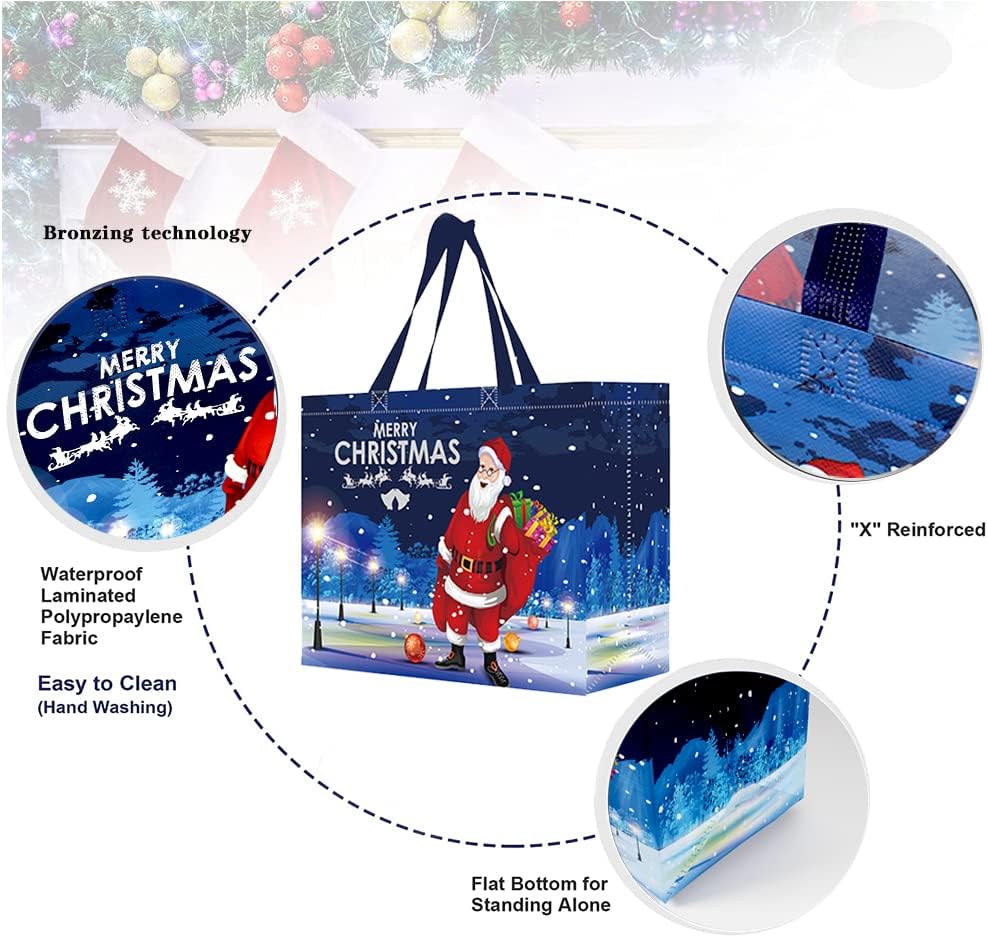 - 🎁Upgraded Quality:The words [ Merry Christmas] and [Happy Holiday] are gilding, much more exquisite and shining. Bag body are Made of good quality non-woven fabric, covered with a film on the surface of jumbo gift bag, waterproof, light,very easy to clean and can be reused. Your recipent will love the gift with such a perfect bag.