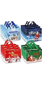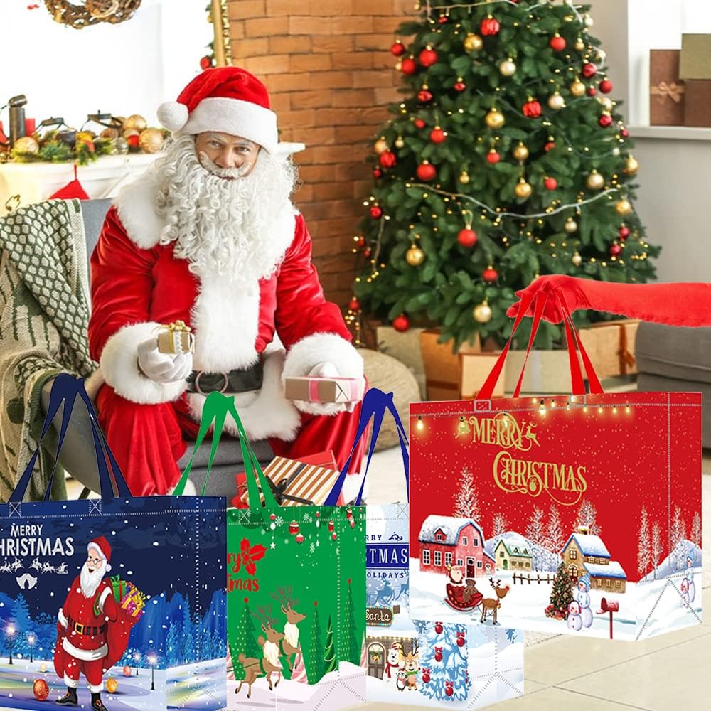- 🎁Package include: 12 pieces Large Christmas Tote Bags of 4 different classic Holiday designs. Reusable christmas shopping bags for presents.
