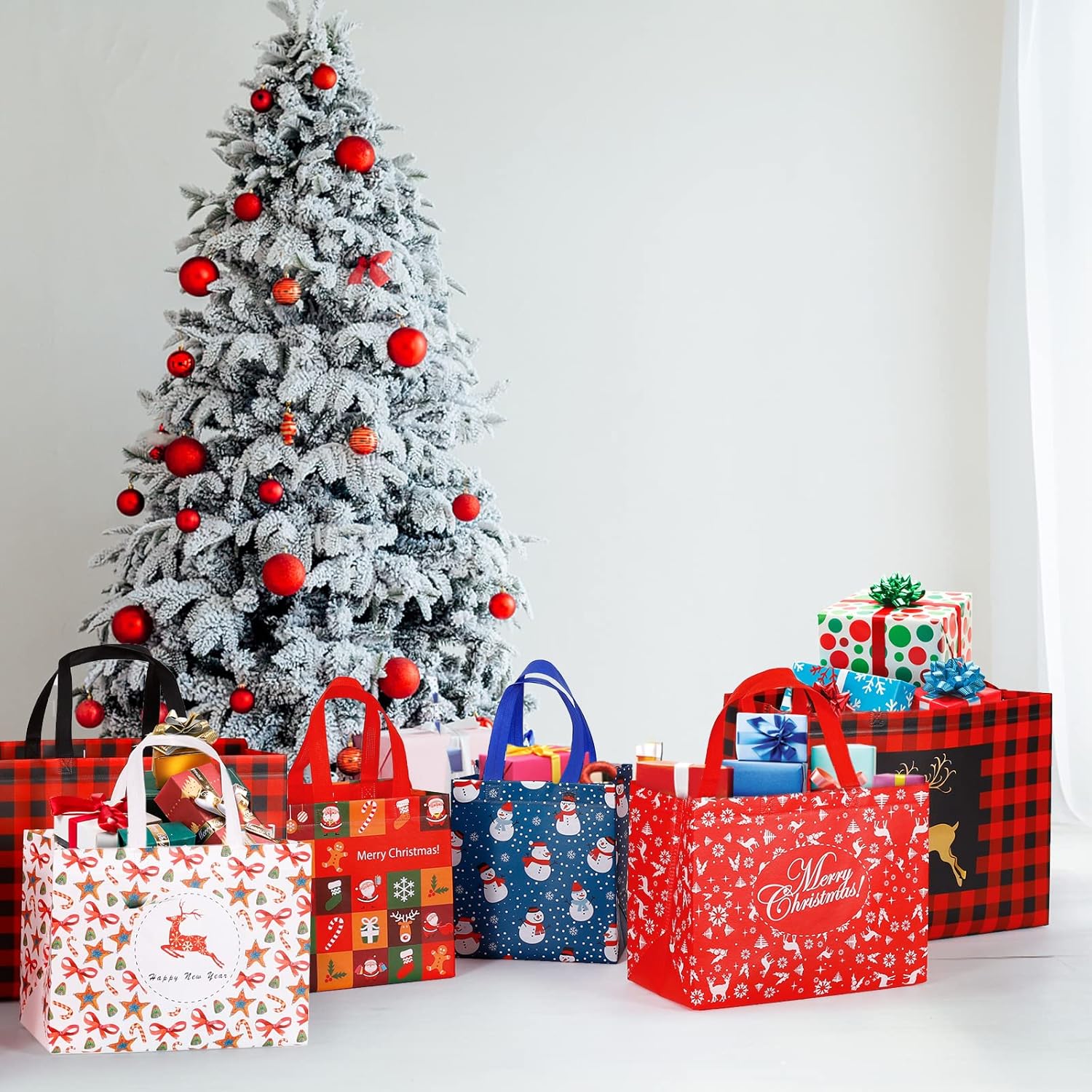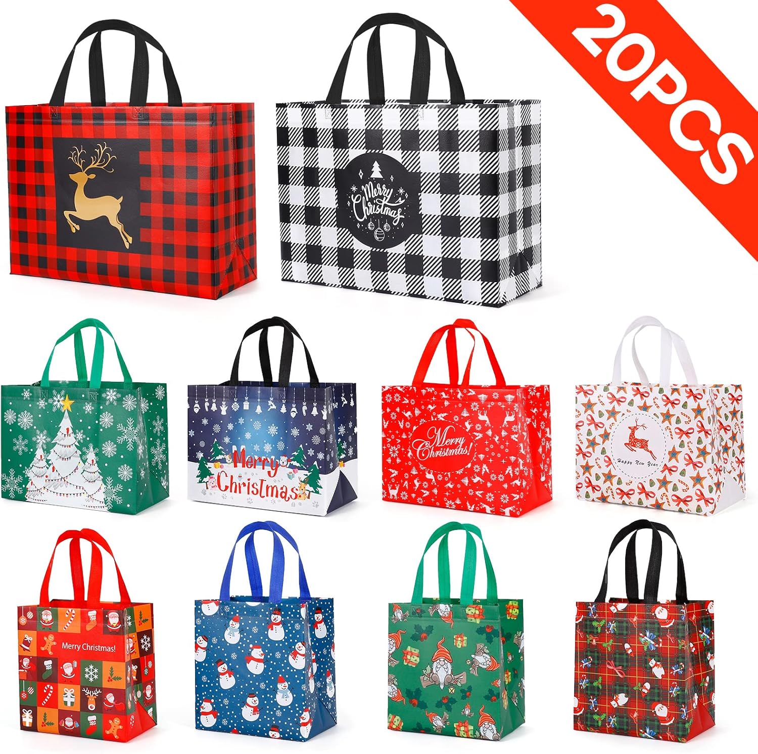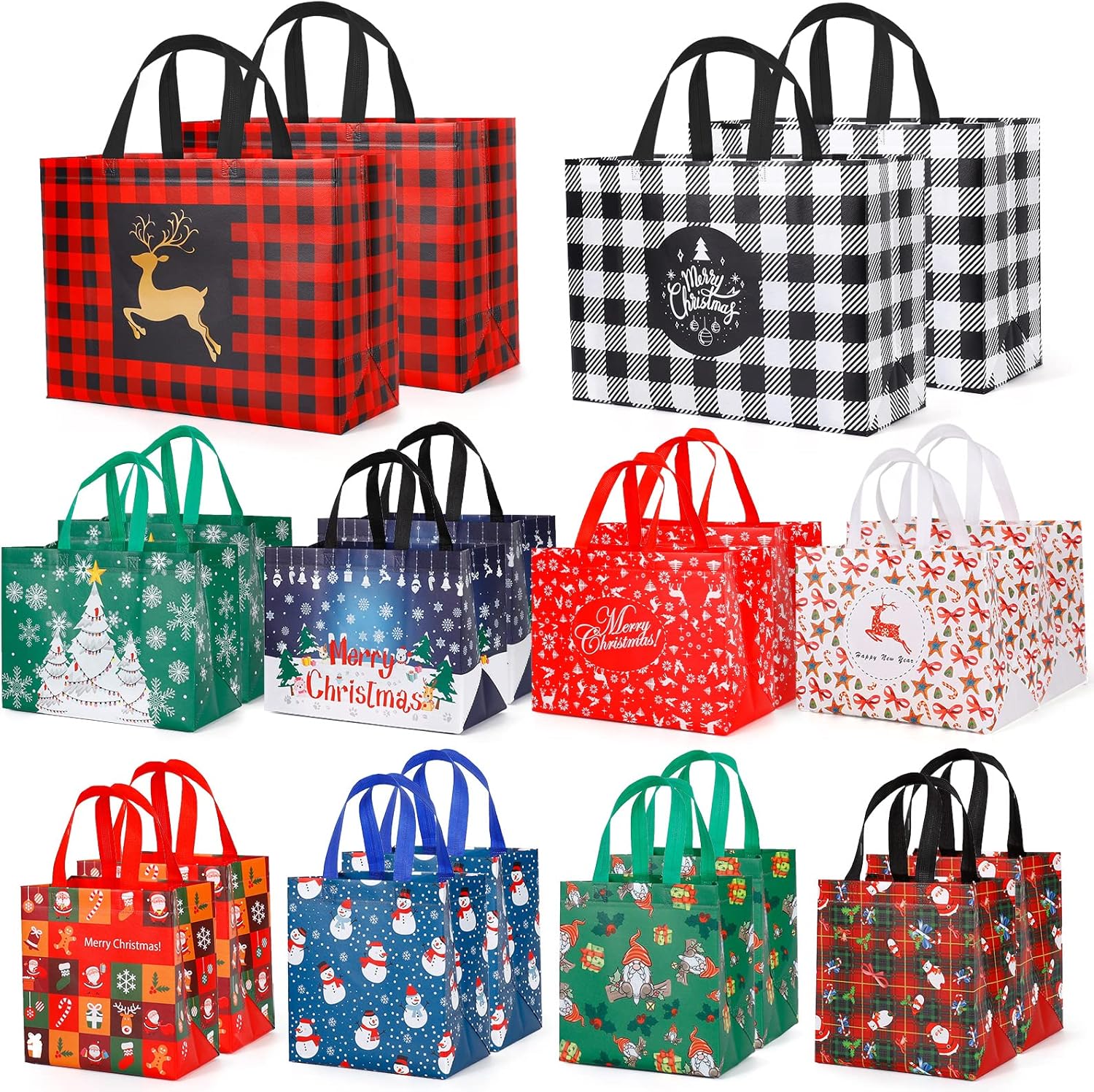 PACKAGE INCLUDES - 32 pack christmas gift bags multipack 3 sizes: 4 Extra Large (17" x 7" x 12.6"inches), 8 Large (12.6" x 6.7" x 9.4"inches), 8 Medium (8.3"x 5.5"x9" inches), sufficient to meet your holiday packing needs.