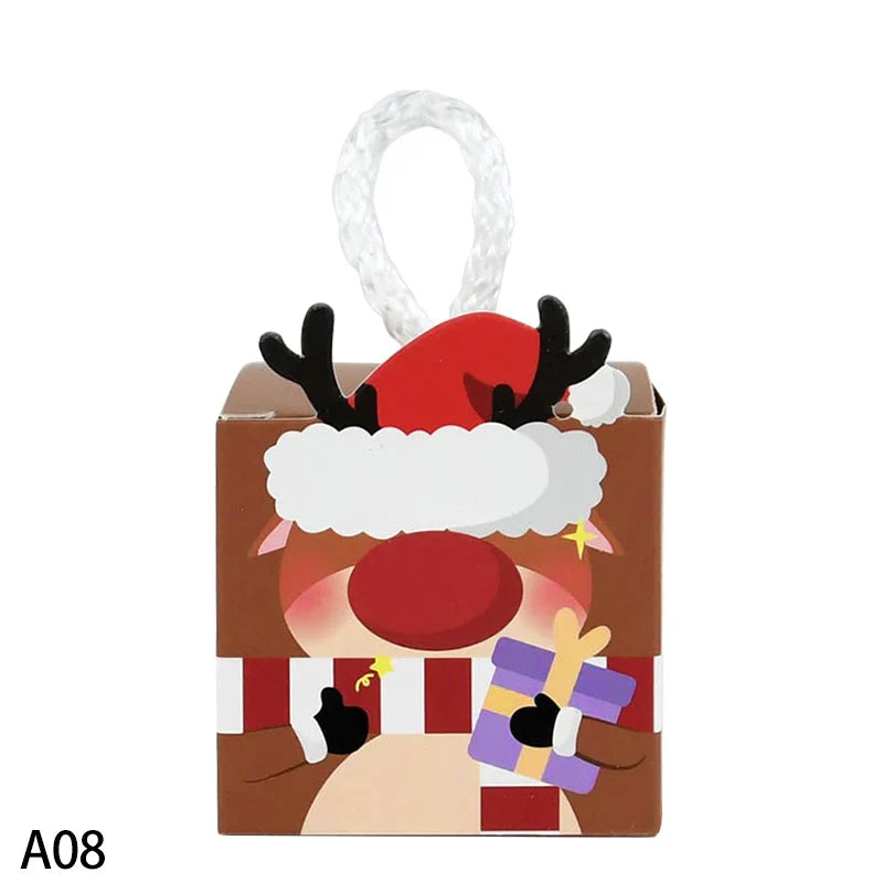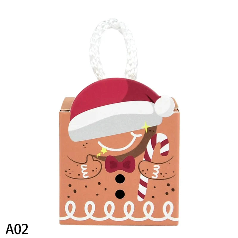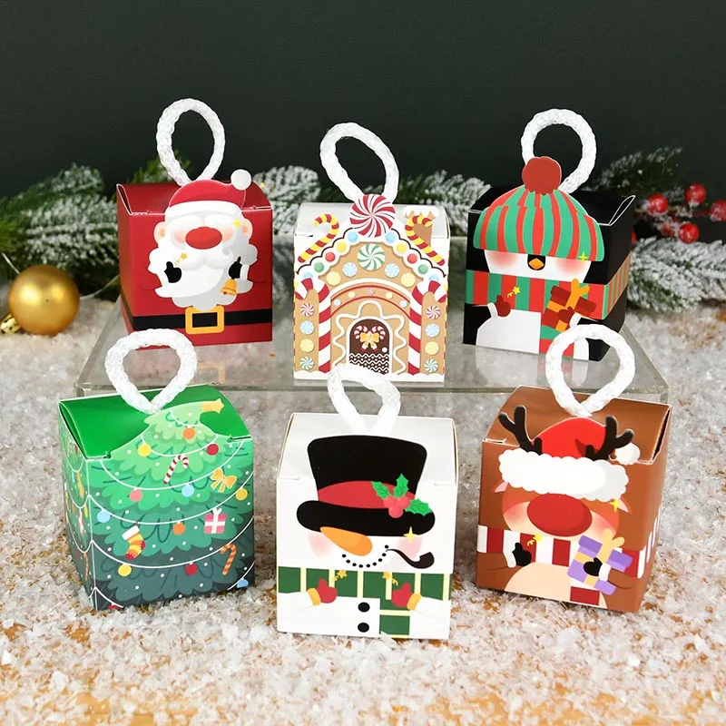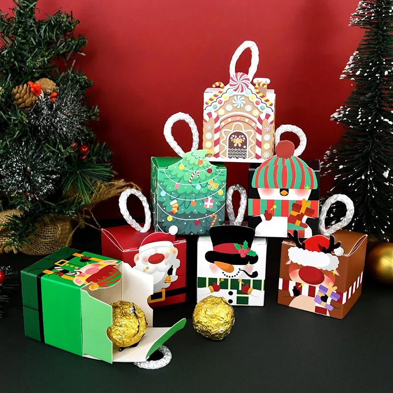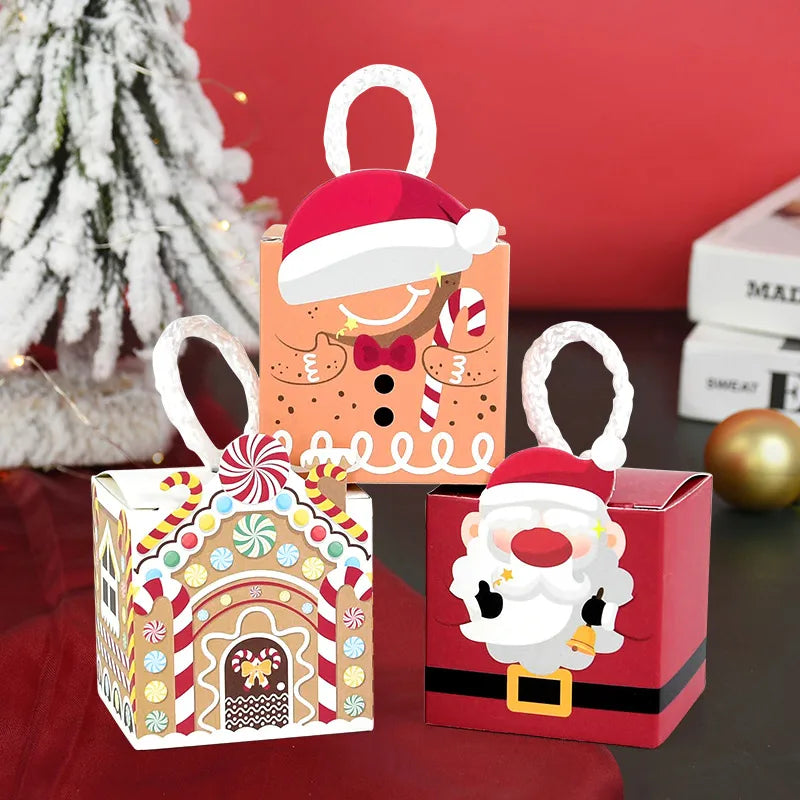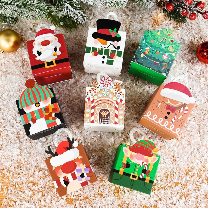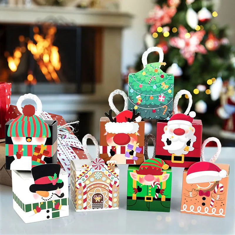 8Pcs Christmas Treat Boxes With Handles With Santa/Snowman/Christmas Tree Prints For Xmas Party Favor Packaging Gift Giving