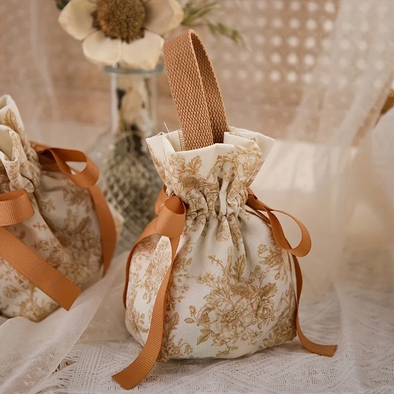 Elegant Red Drawstring Gift Bag with Floral Pattern & Ribbon Bow - Soft,Reusable Canvas Pouch for Jewelry Perfect for Christmas