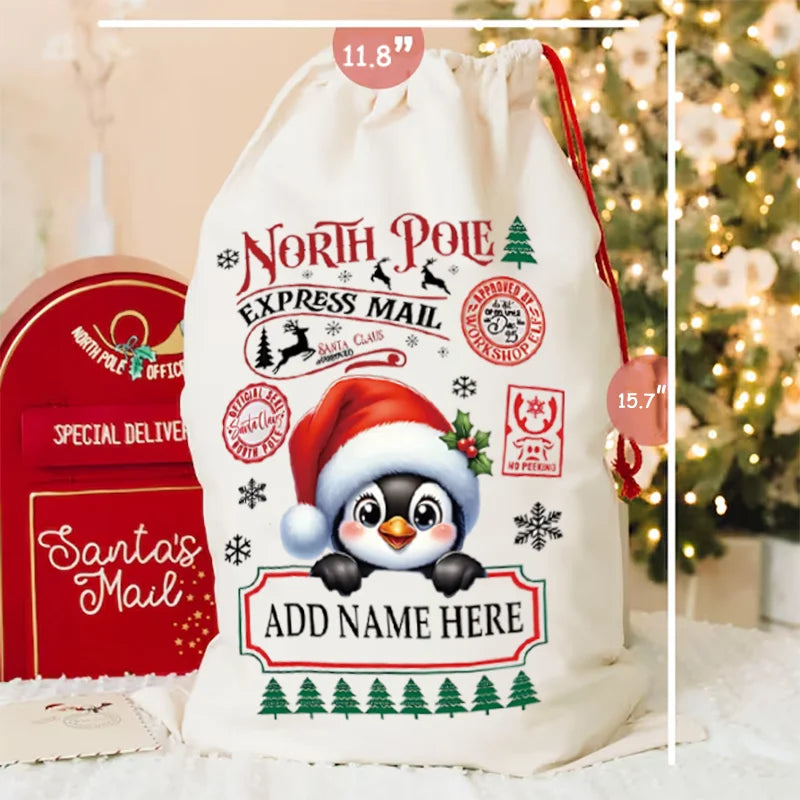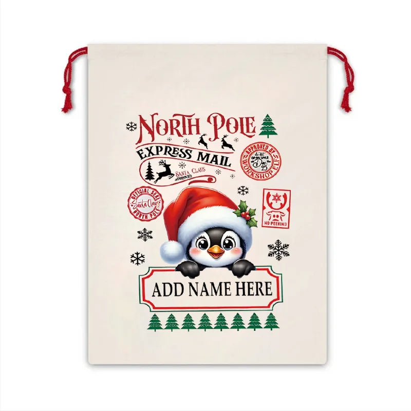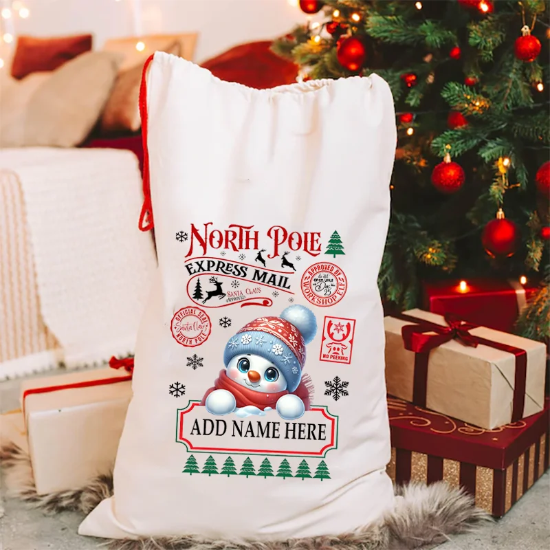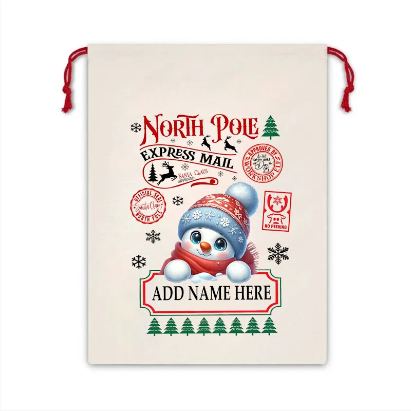 Personalized Christmas Snowman Canvas Sack Custom Cartoon and Name Design Drawstring Gift Bag for Christmas Gifts & Decoration