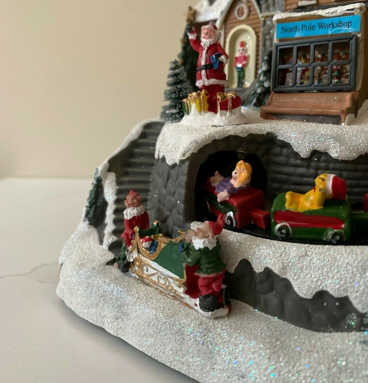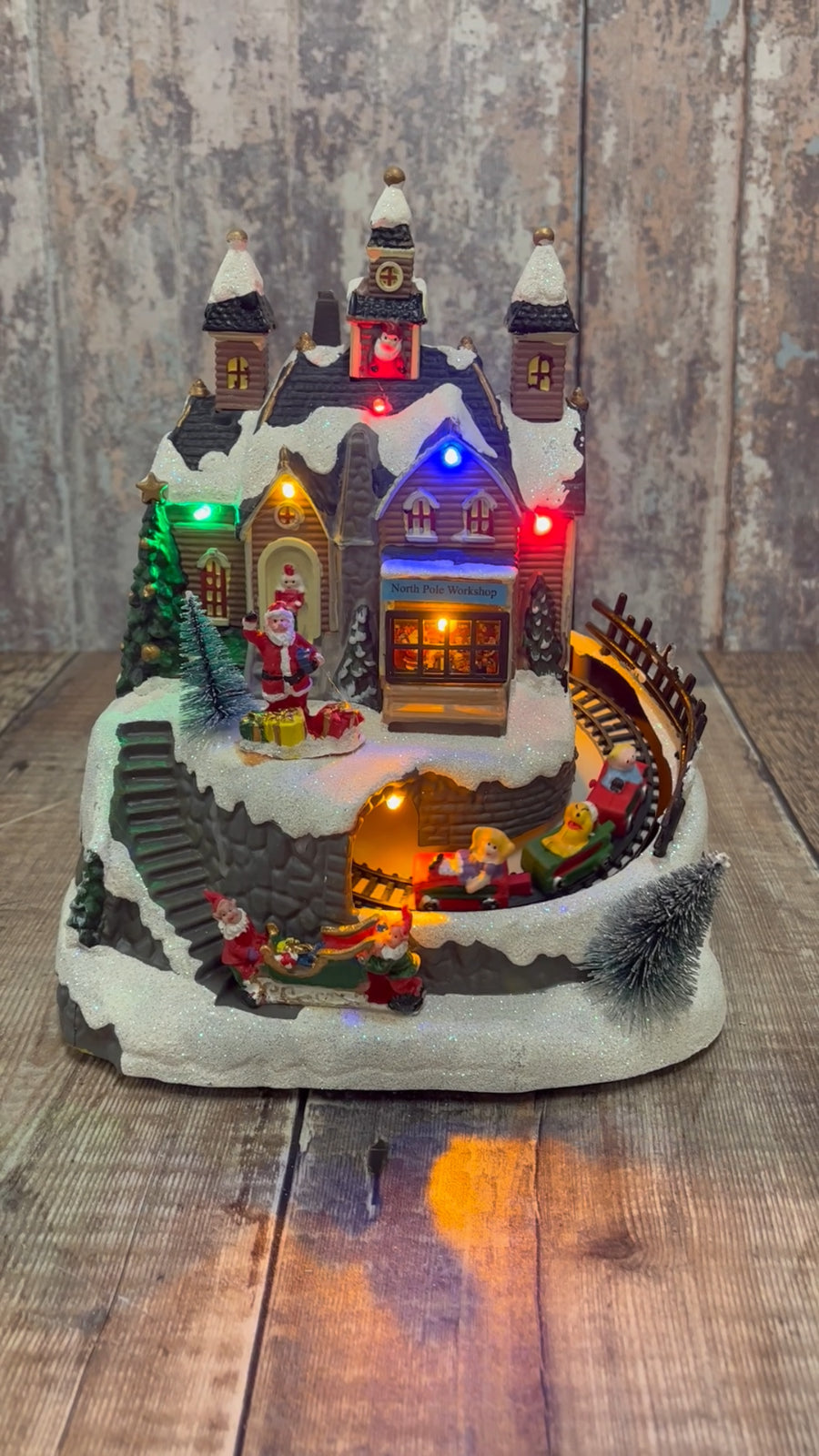Set in the North pole, Santa stands in front of his workshop with a bag of gifts, while a train of happy children goes through a tunnel under the village. The buildings are lit with LEDs and the train rotates around creating a festive mood that will keep children and adults captivated alike.