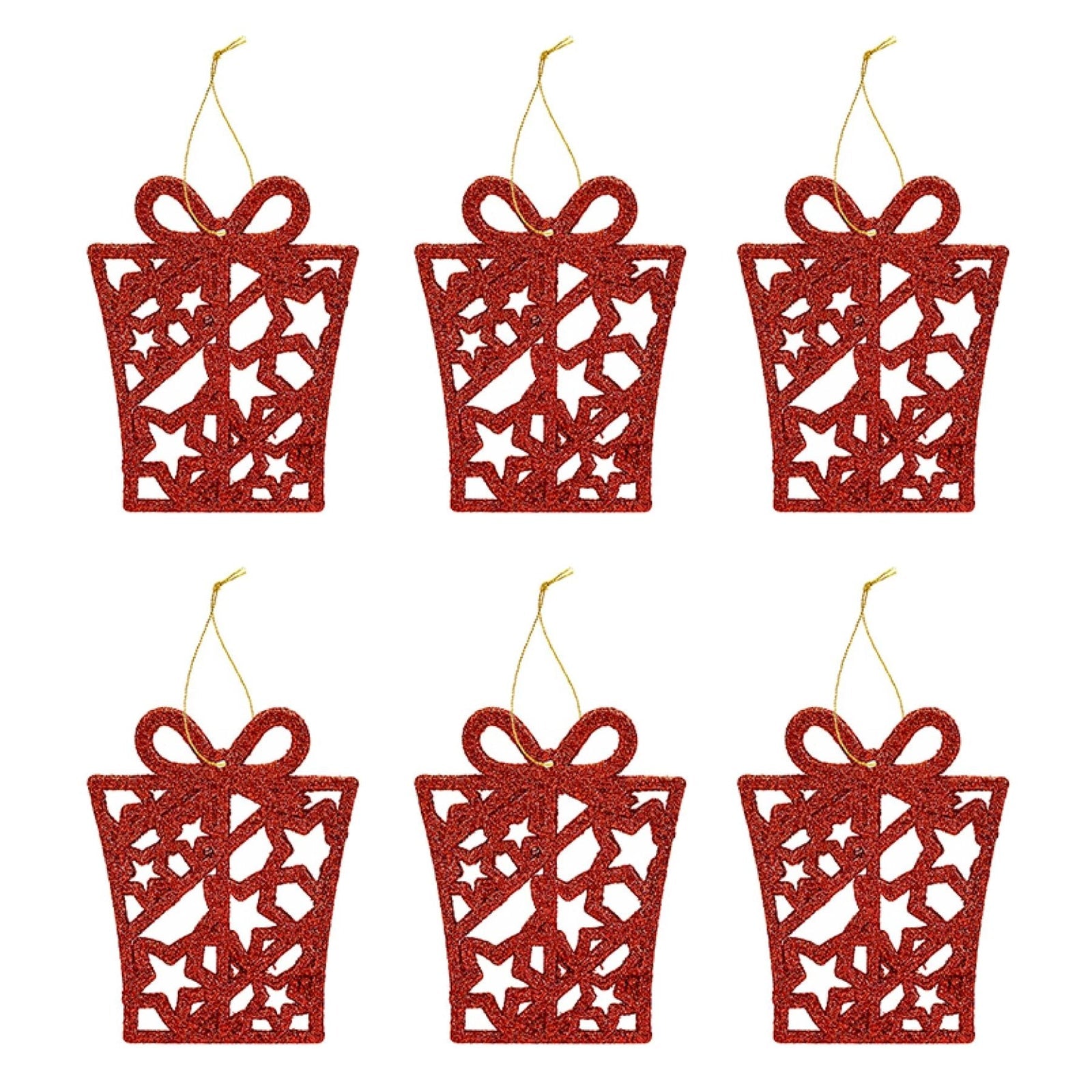 • This exquisite set of six tree decorations is designed to elevate the festive spirit of your Christmas tree with their stunning present shape and full glitter finish.