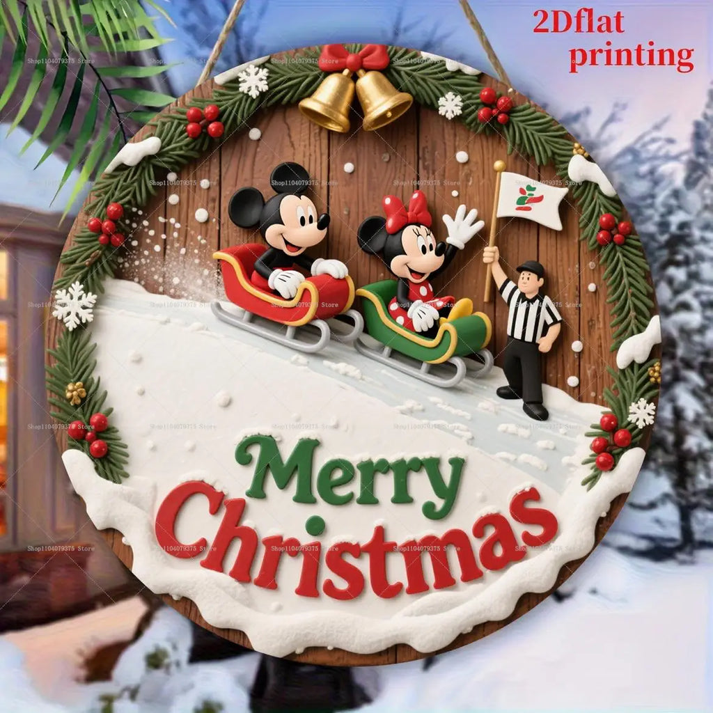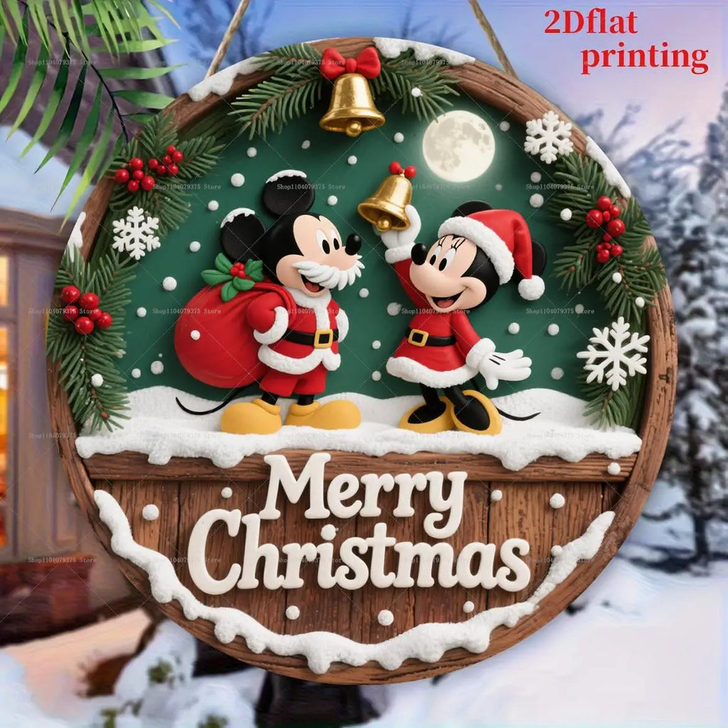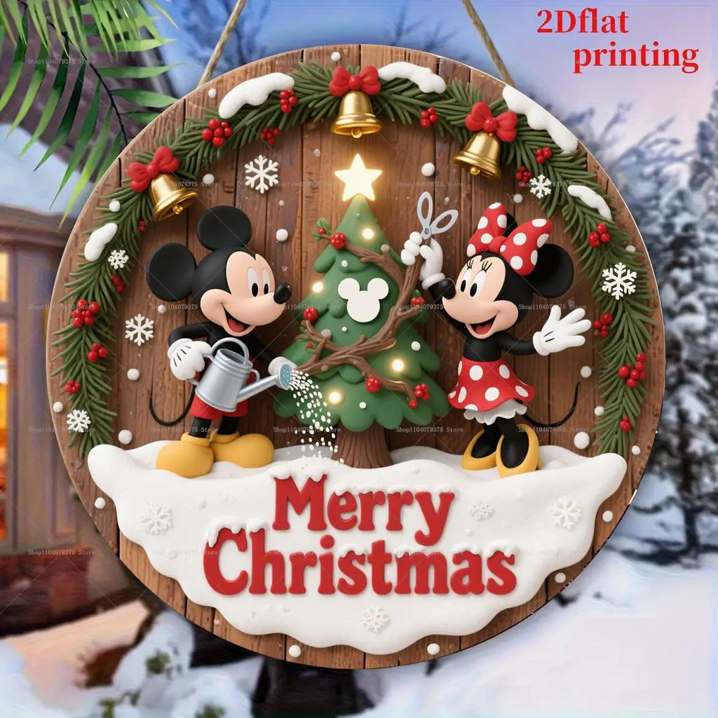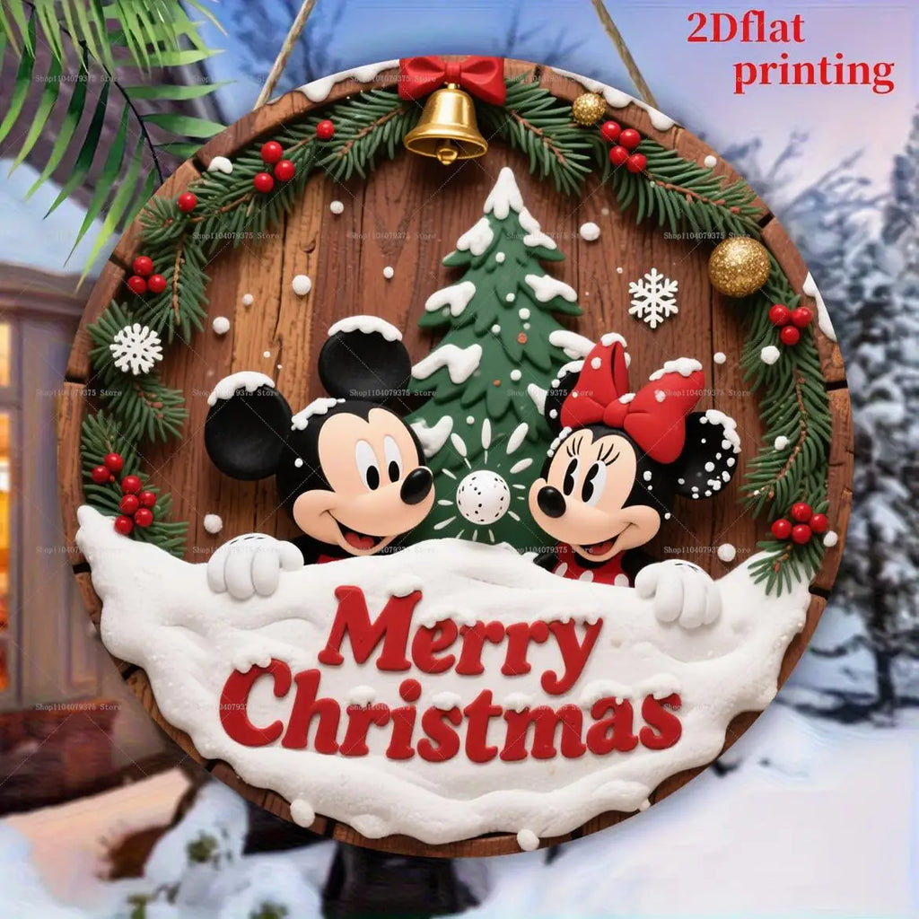 Merry Christmas Disney Mickey Minnie Sign Personalized Round Wood Hanging Plaque Front Door Wall Holiday Gathering Decoration