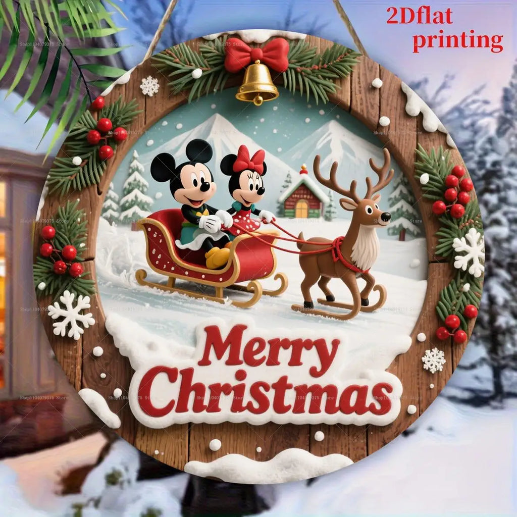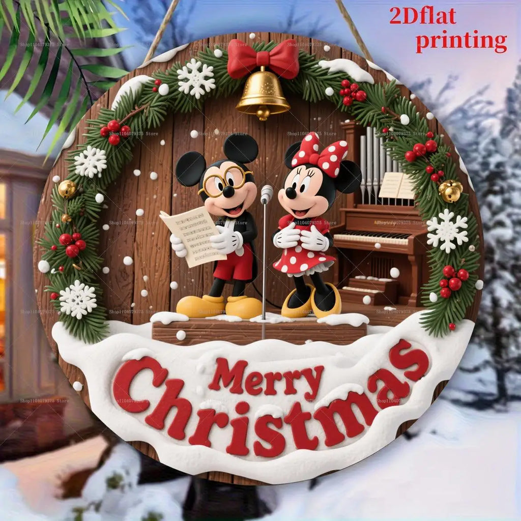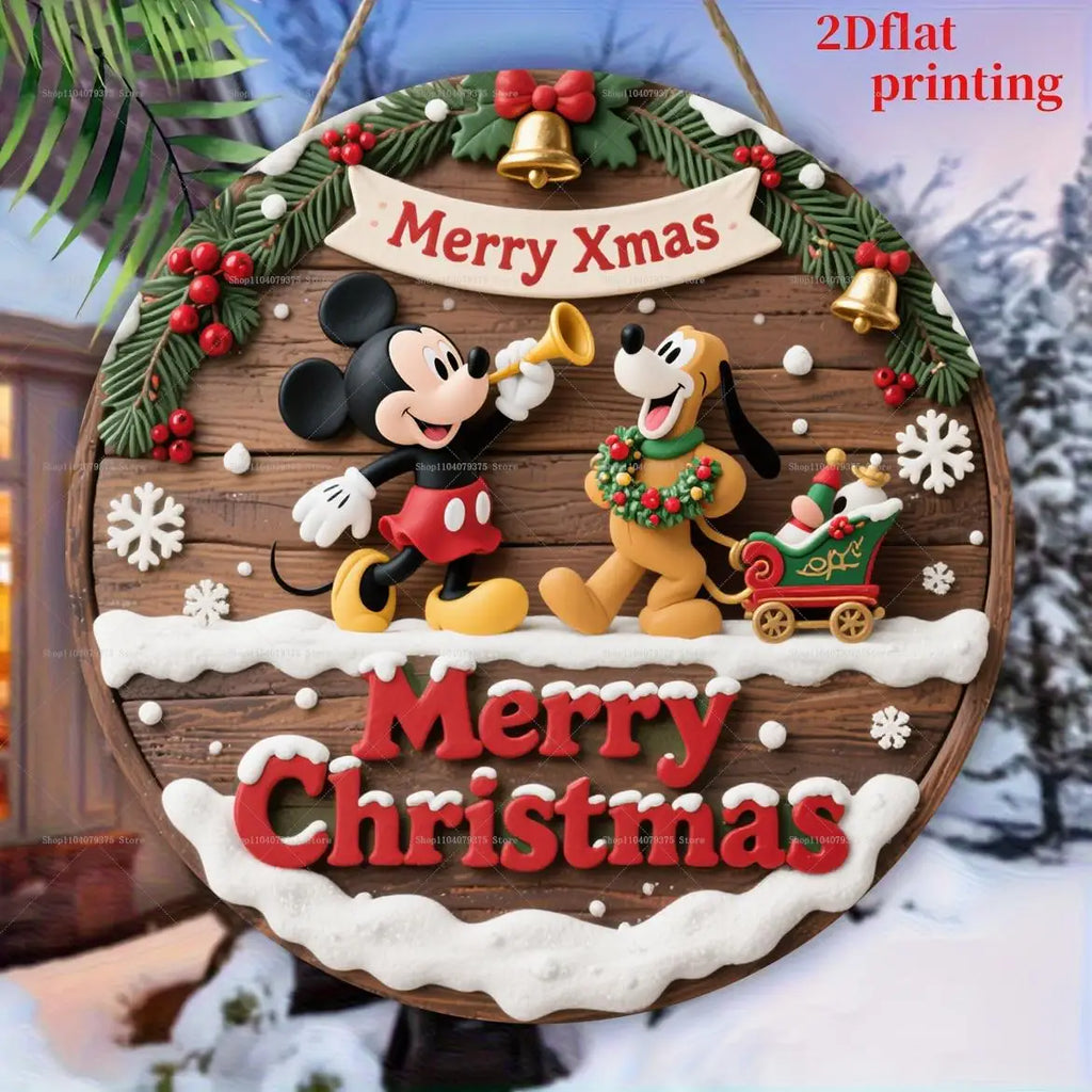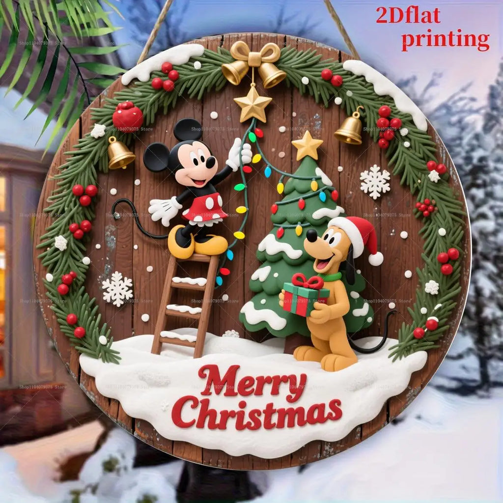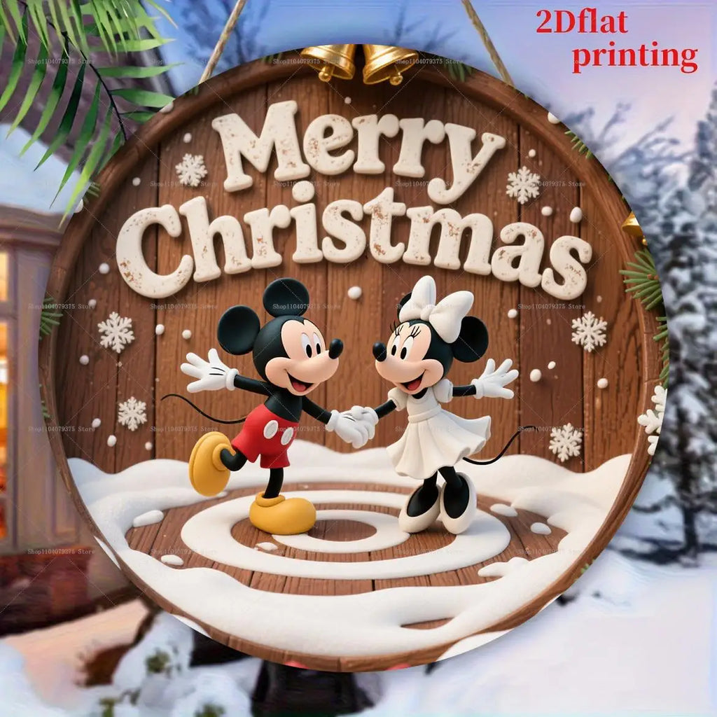 Merry Christmas Disney Mickey Minnie Sign Personalized Round Wood Hanging Plaque Front Door Wall Holiday Gathering Decoration