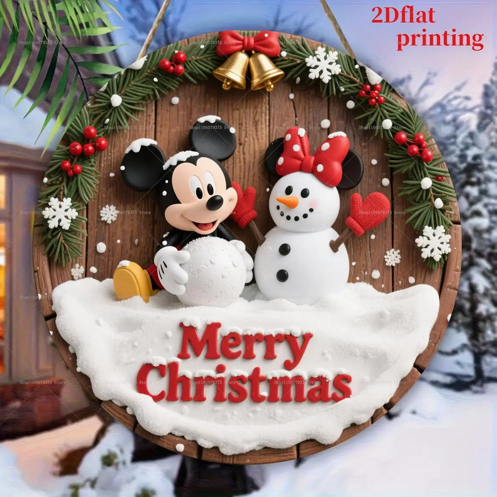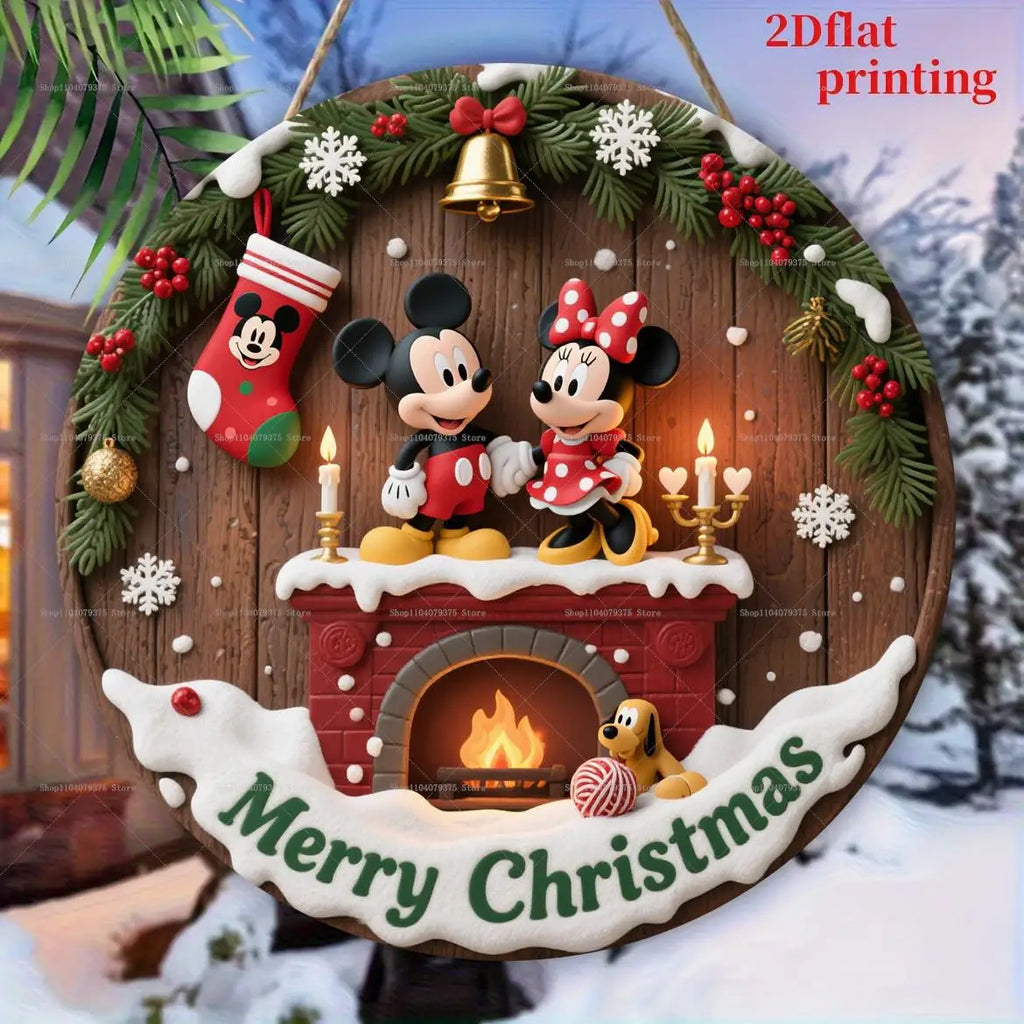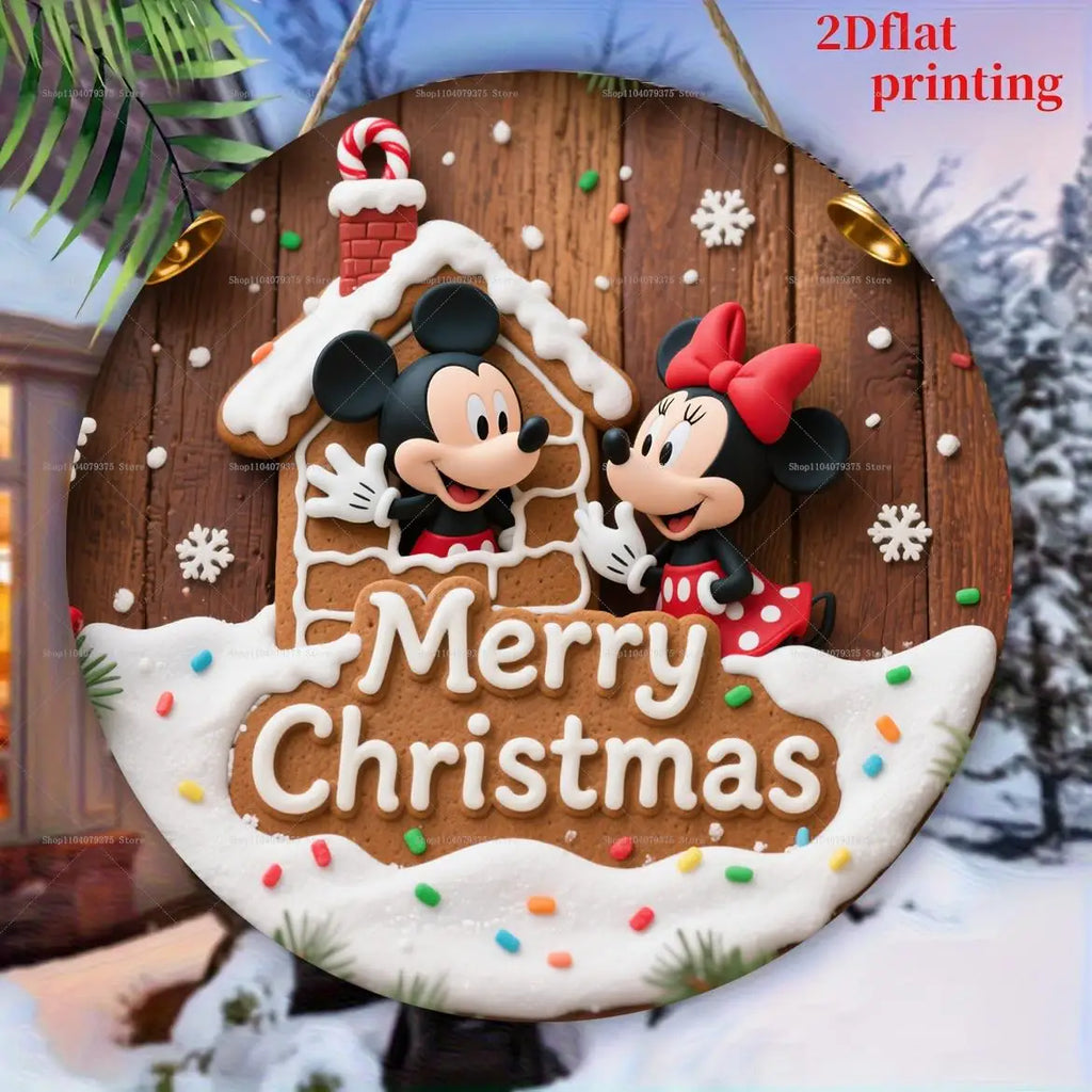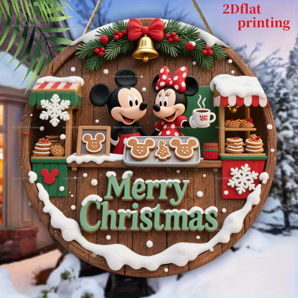 Merry Christmas Disney Mickey Minnie Sign Personalized Round Wood Hanging Plaque Front Door Wall Holiday Gathering Decoration