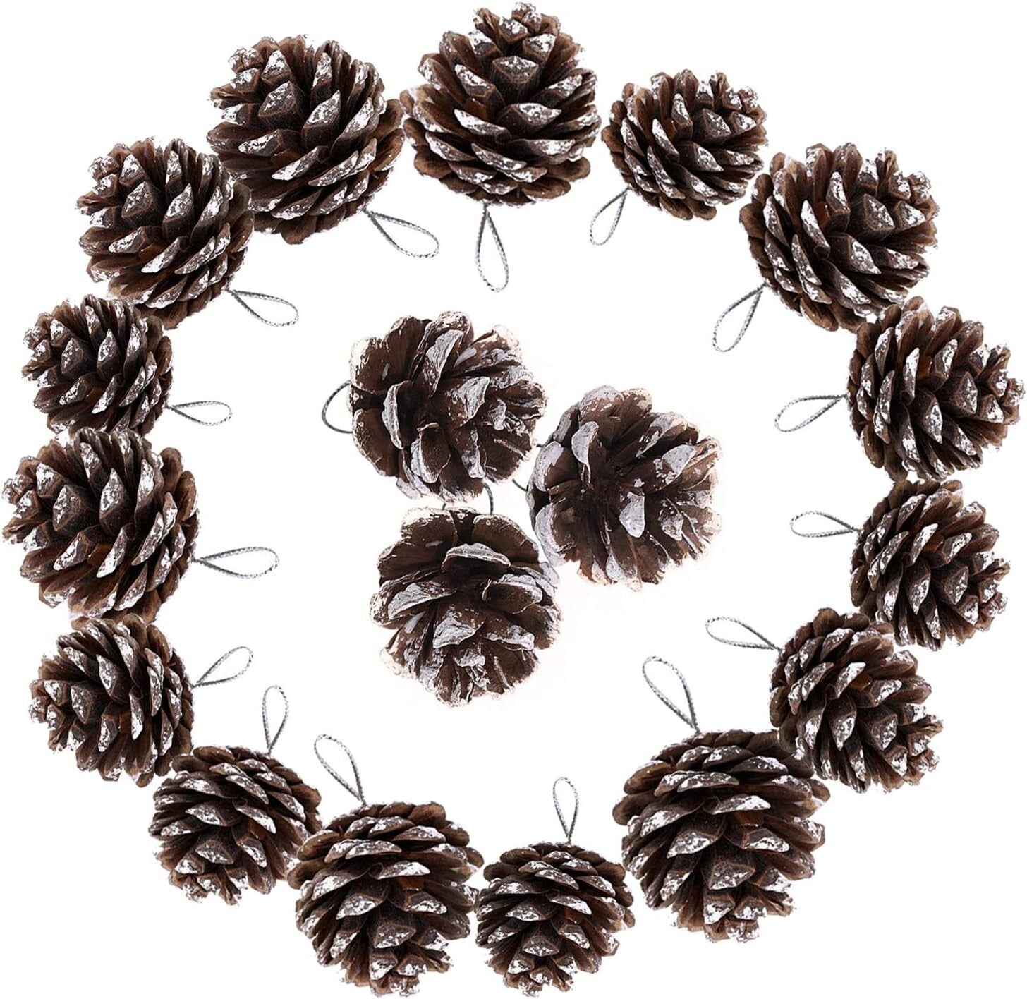 18 FESTIVE PINE CONES; You will receive a total of 18 pinecones attached to a loop of silver metallic thread for hanging. The average size of each pine cone is approximately 5 x 4cm (L x W)