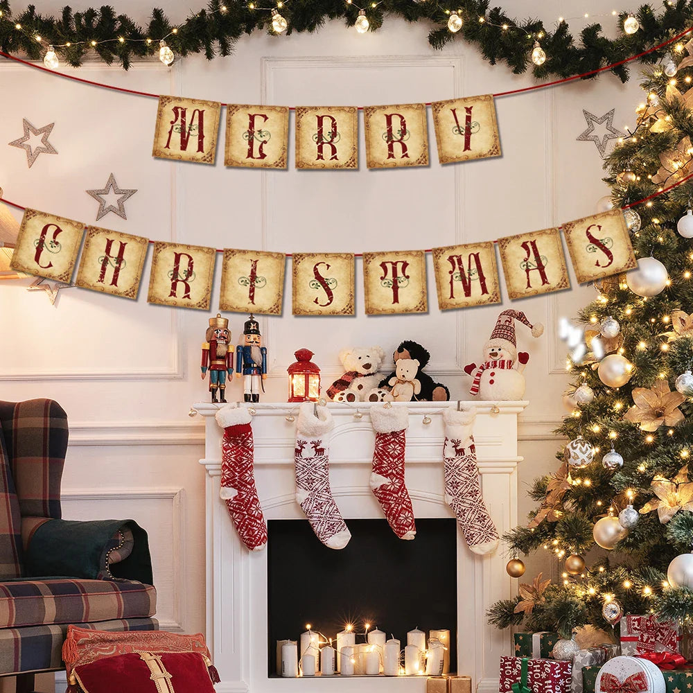 Vintage Merry Christmas Banner Christmas themed party decoration Hanging Retro Nostalgic bunting garland xmas new year decor
