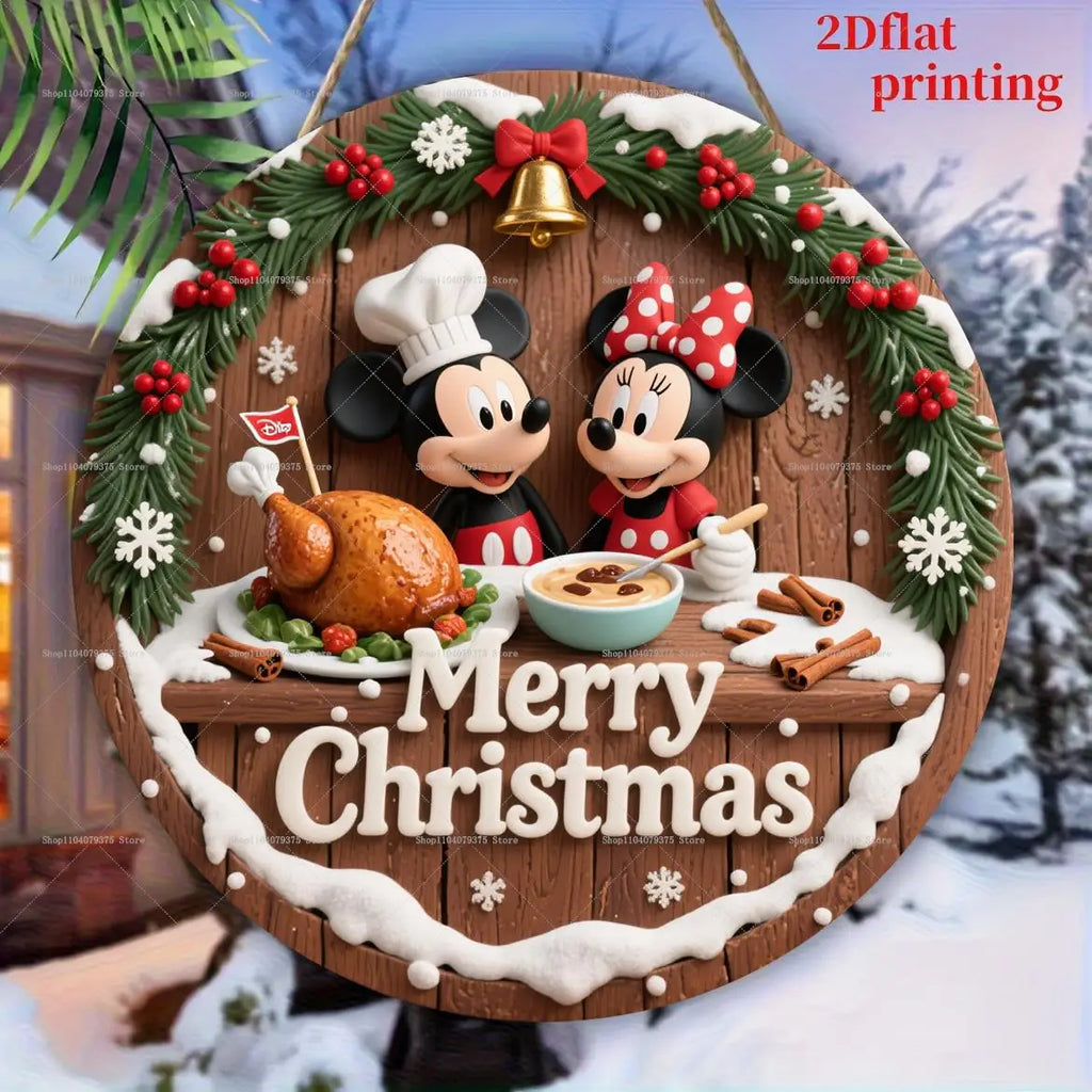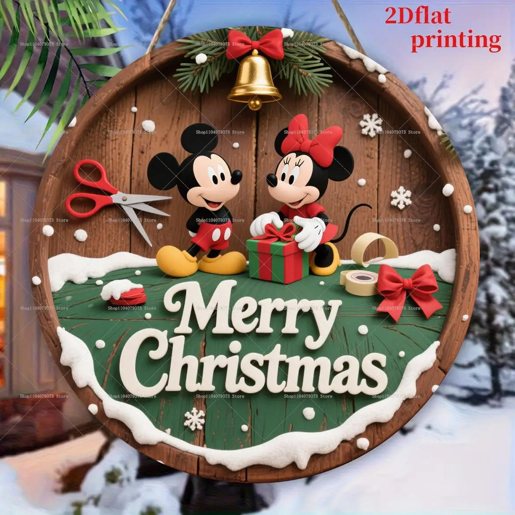 Merry Christmas Disney Mickey Minnie Sign Personalized Round Wood Hanging Plaque Front Door Wall Holiday Gathering Decoration