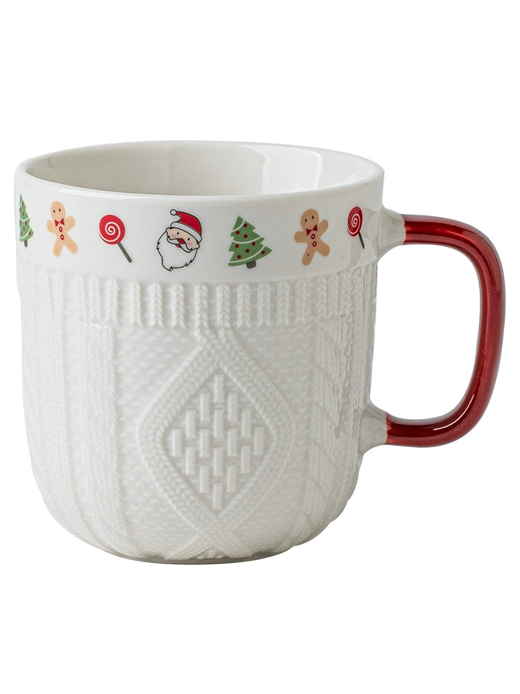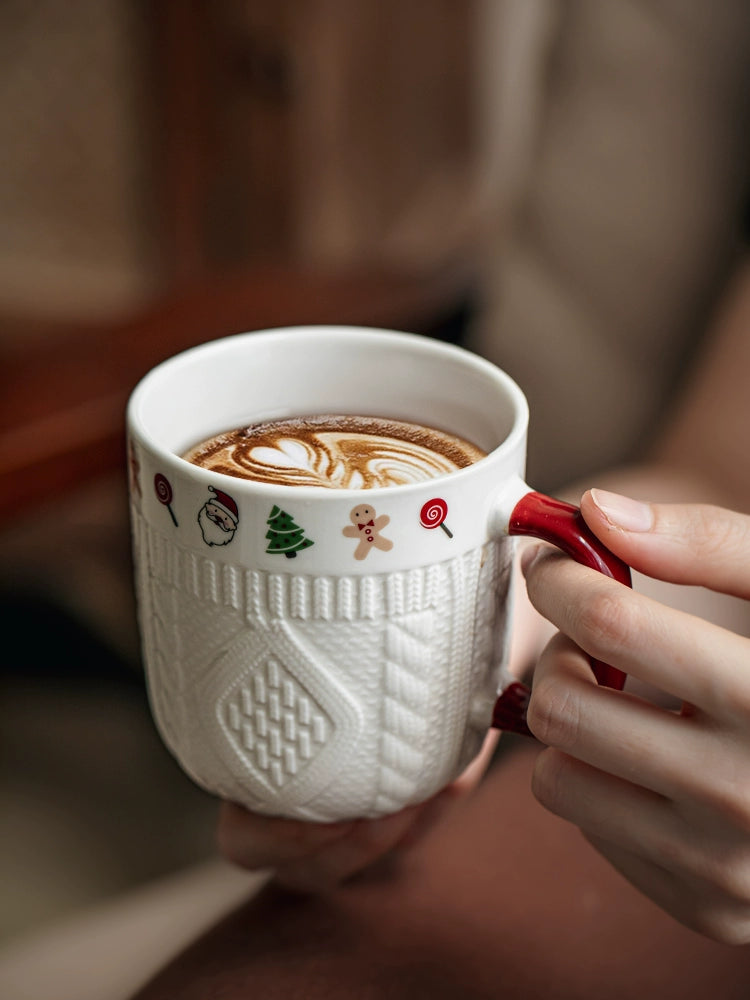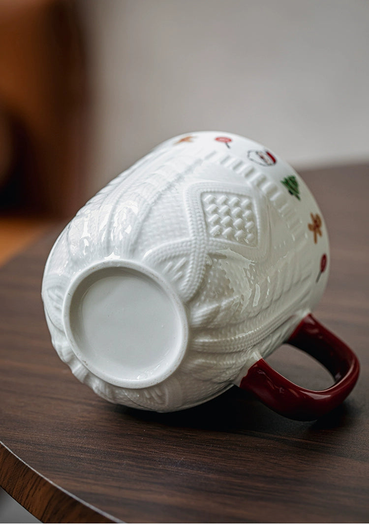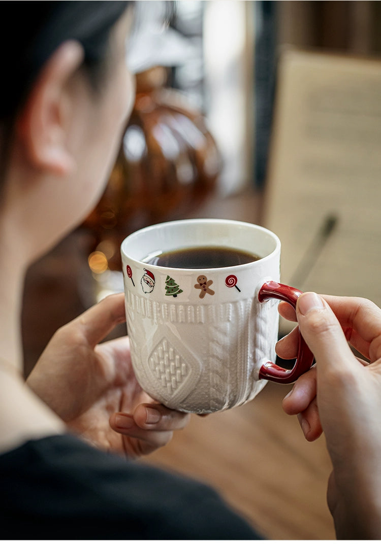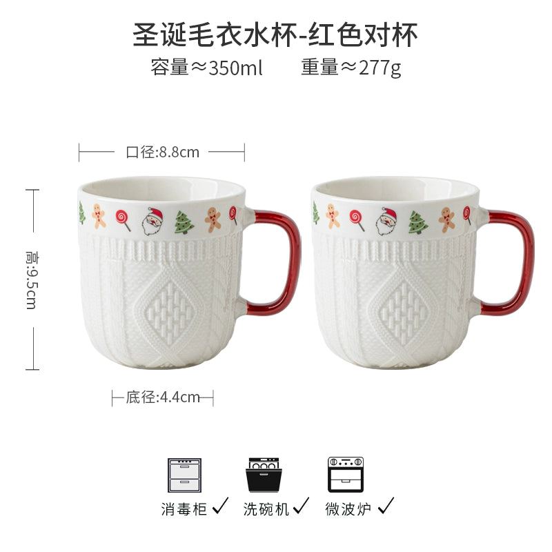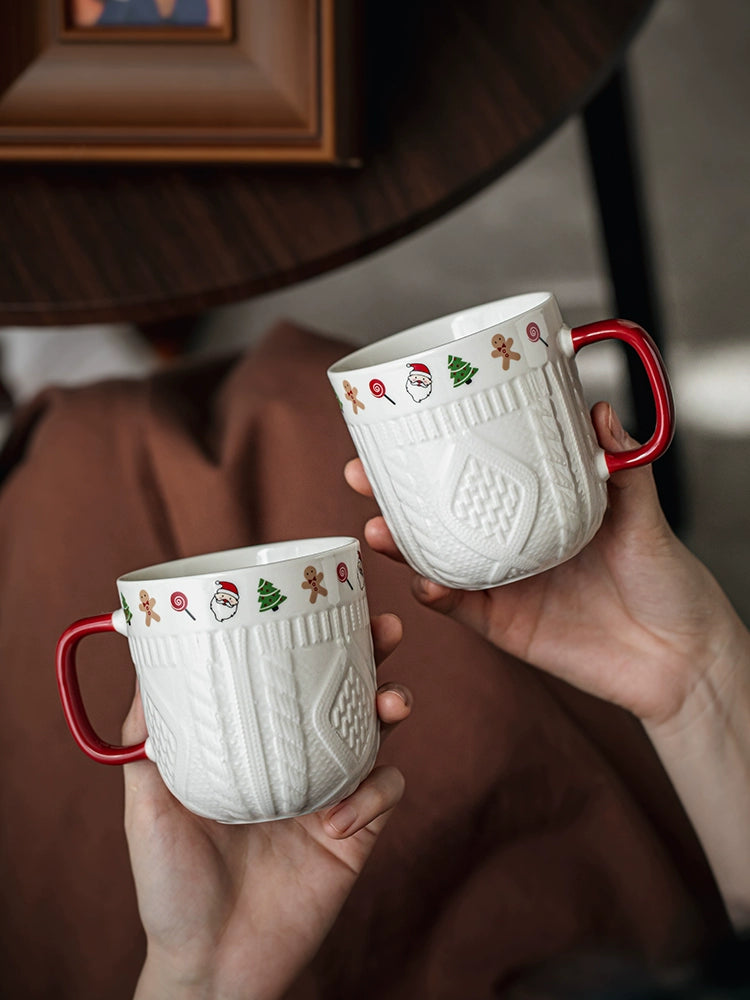 Beautiful embossed Christmas cup ceramic mug set - Christmas Sweater Cups - Red Pair is backordered and will ship as soon as it is back in stock.