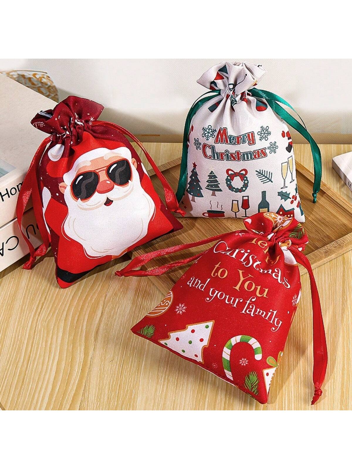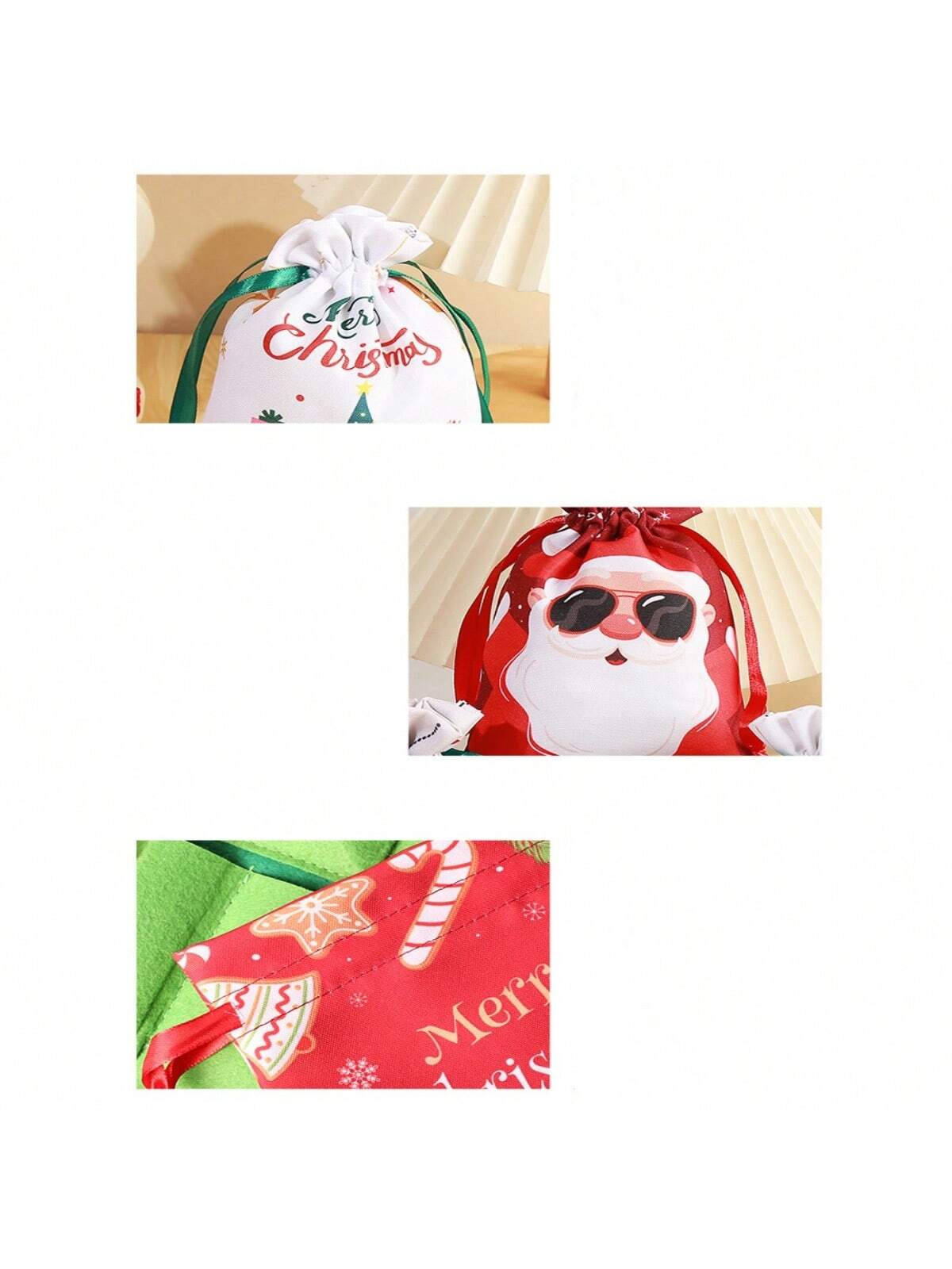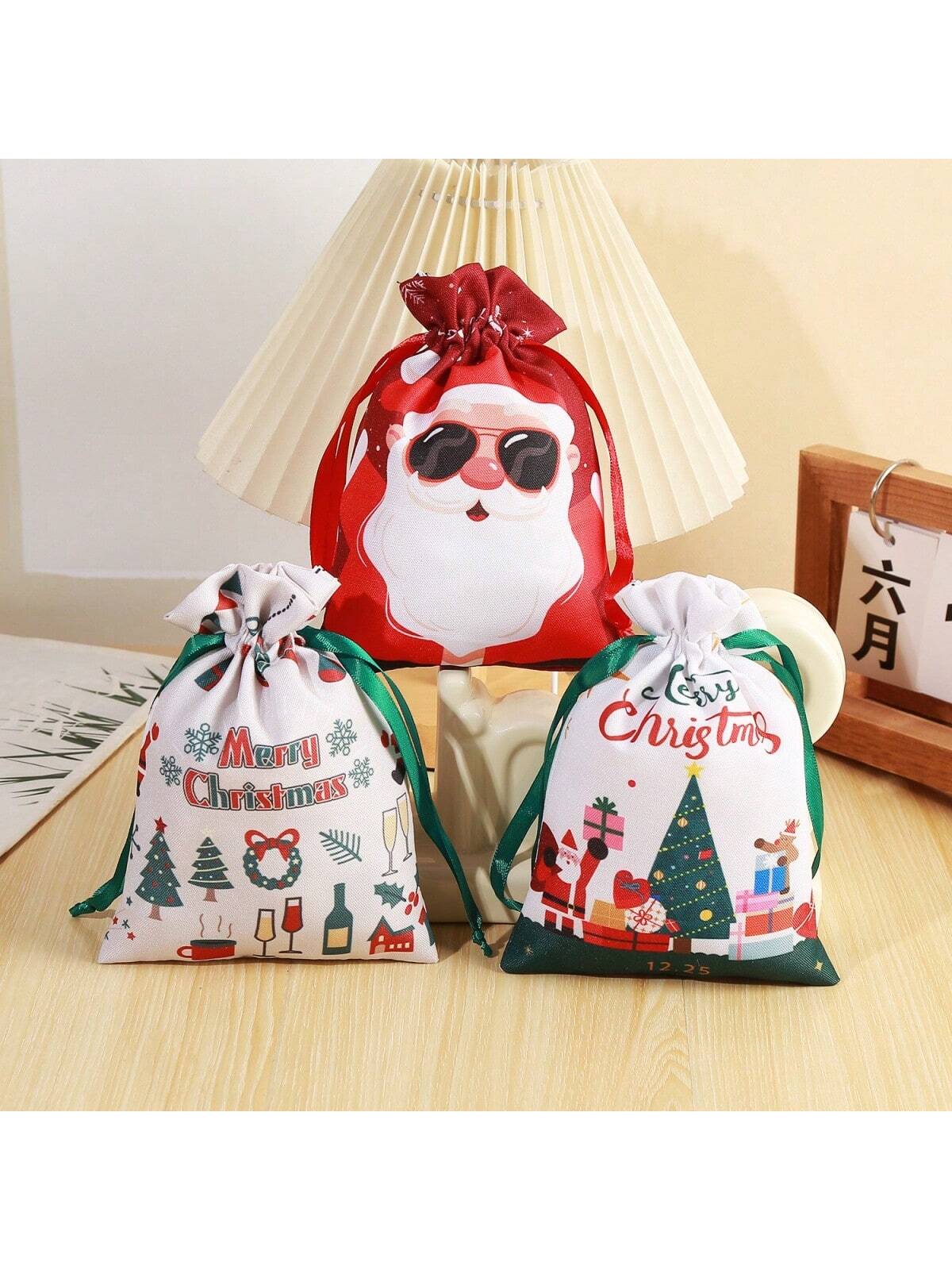 Christmas 100% Cotton Gift Bag Set, Santa Claus Drawstring Party Favor Pouches