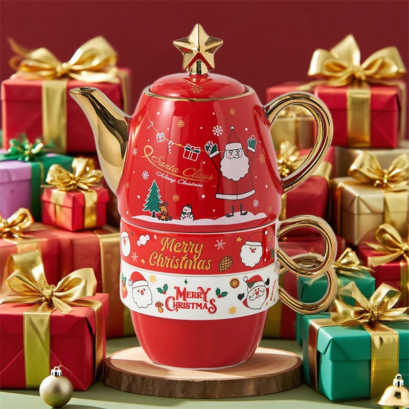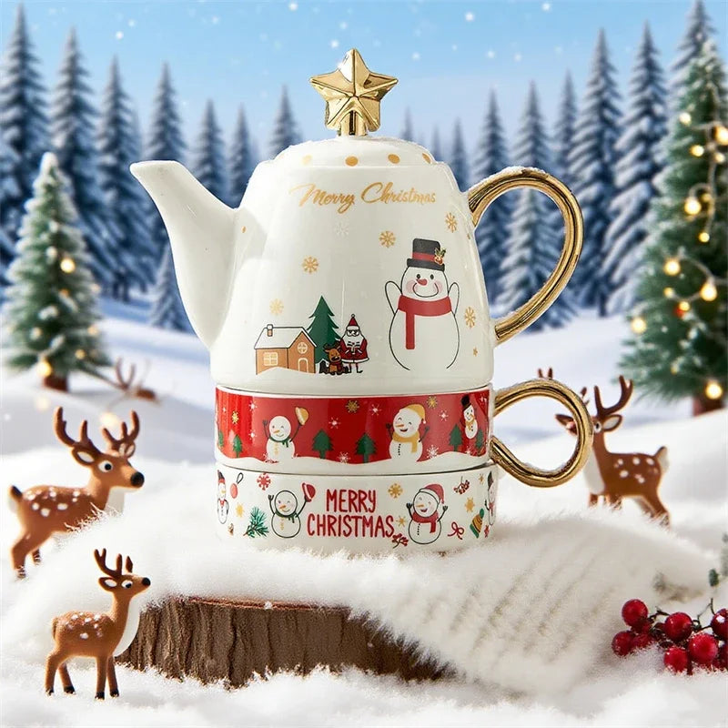 Christmas Teaware Sets Ceramic Teapot Teacups Set Gold Plated Handle Santa Elk Christmas Tree Afternoon Tea Cup Xmas Gifts Decor - White Elk is backordered and will ship as soon as it is back in stock.