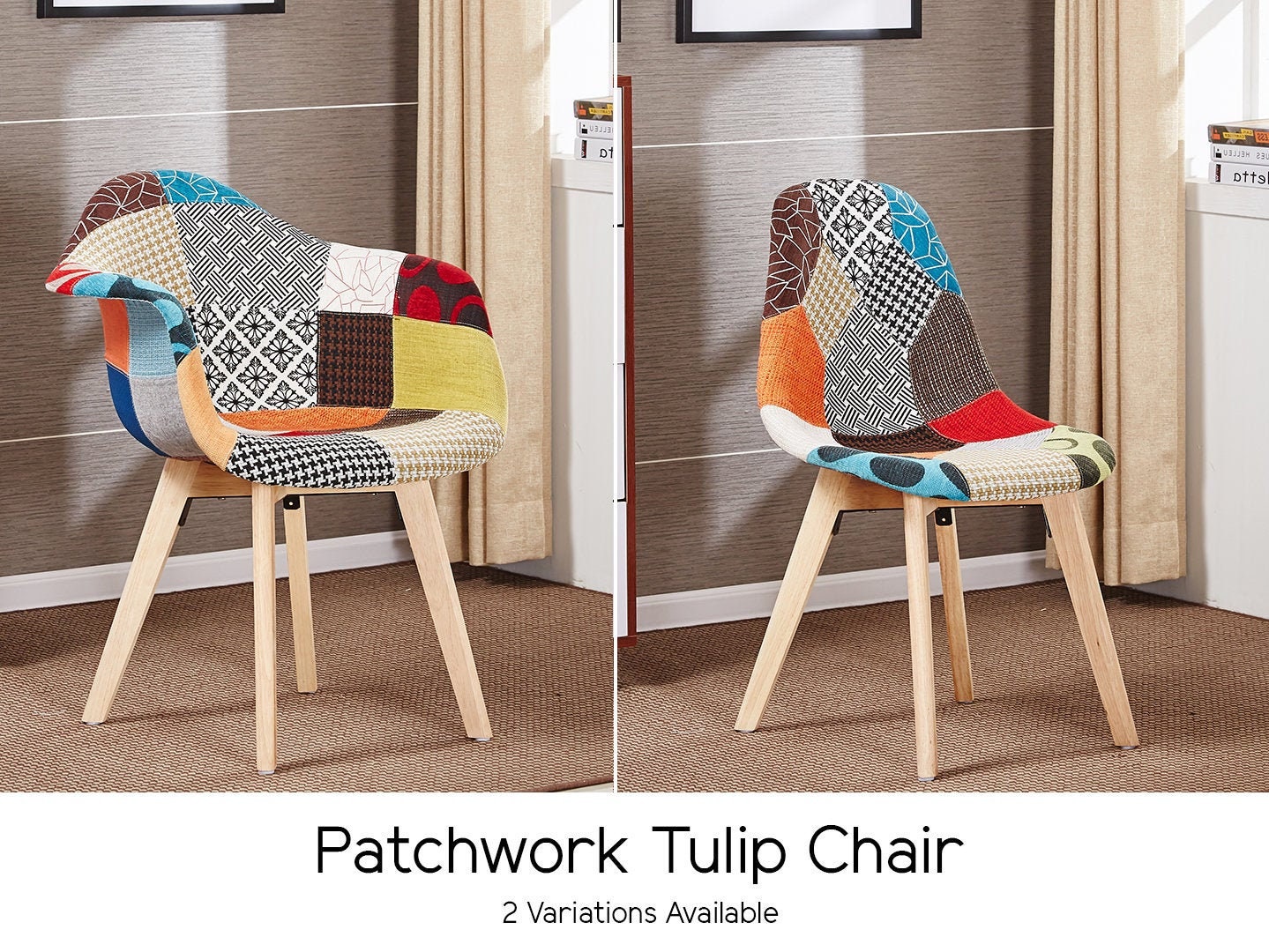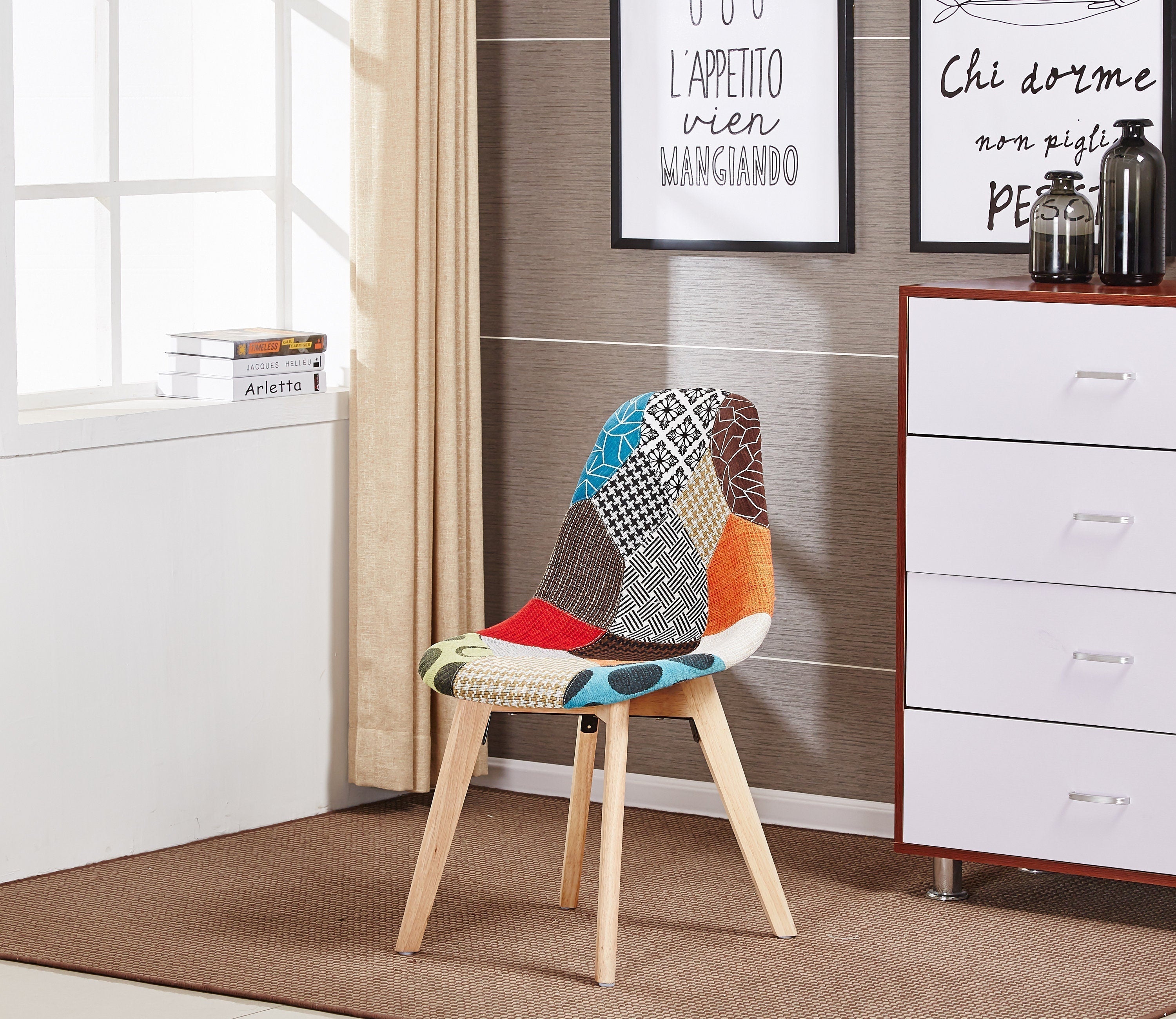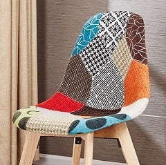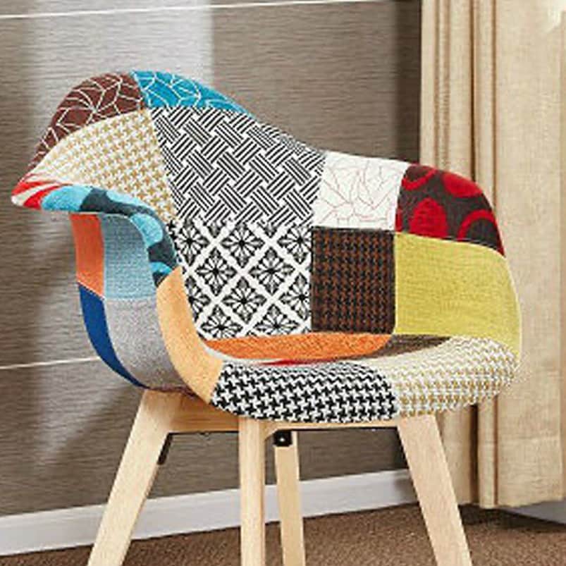 •   Beautiful, hand-finished patchwork fabric chair with Scandinavian style wooden legs