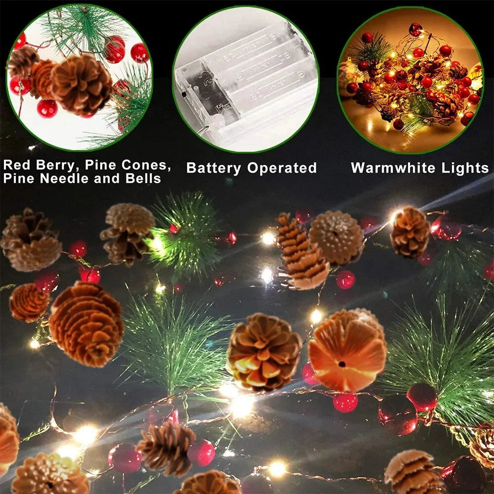 20 LED 6.5FT Pinecone String Lights Pine Needle Red Berry Garland Lights Battery Operated Fairy String Lights Home Decoration