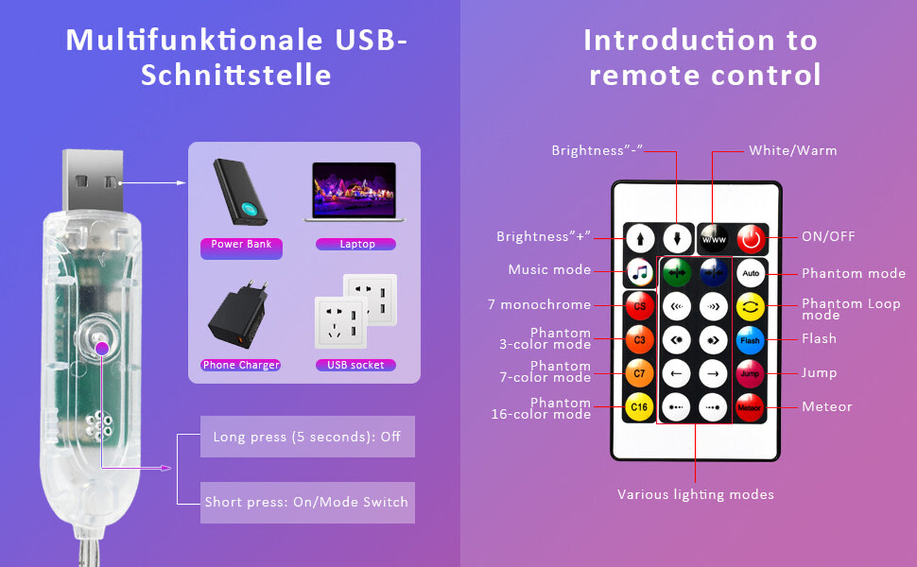 【APP Control & Remote Control & USB Controller】You can download the ZENGGE APP by scanning the QR code of the handle, Bluetooth connection, both Android and IOS systems can be used. The indoor led string light is equipped with a remote control, and you can also use the remote control to control the led string's color, brightness and mode.