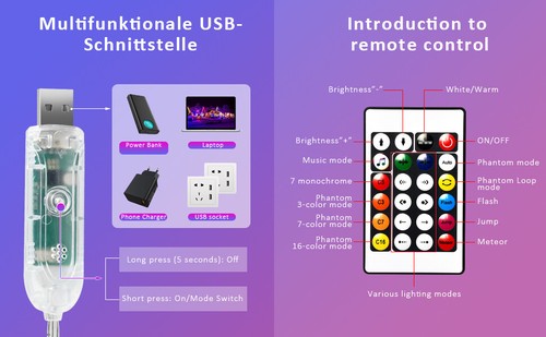 Specification: Control modes: Bluetooth Controller: Bluetooth controller Working voltage: 5V Light color: RGB IC Size: 10m 100LEDs,15M 150 LEDs Power: USB Color: Multicolour Material: PVC + Plastic + Copper Waterproof rating: IP65 Lifespan: more than 50,000 hours Remote control distance: 5 m Basic color of the stripe: Transparent colors. Package includes: 10m/15m LED Fairy String Lights (The size depends on your choice)