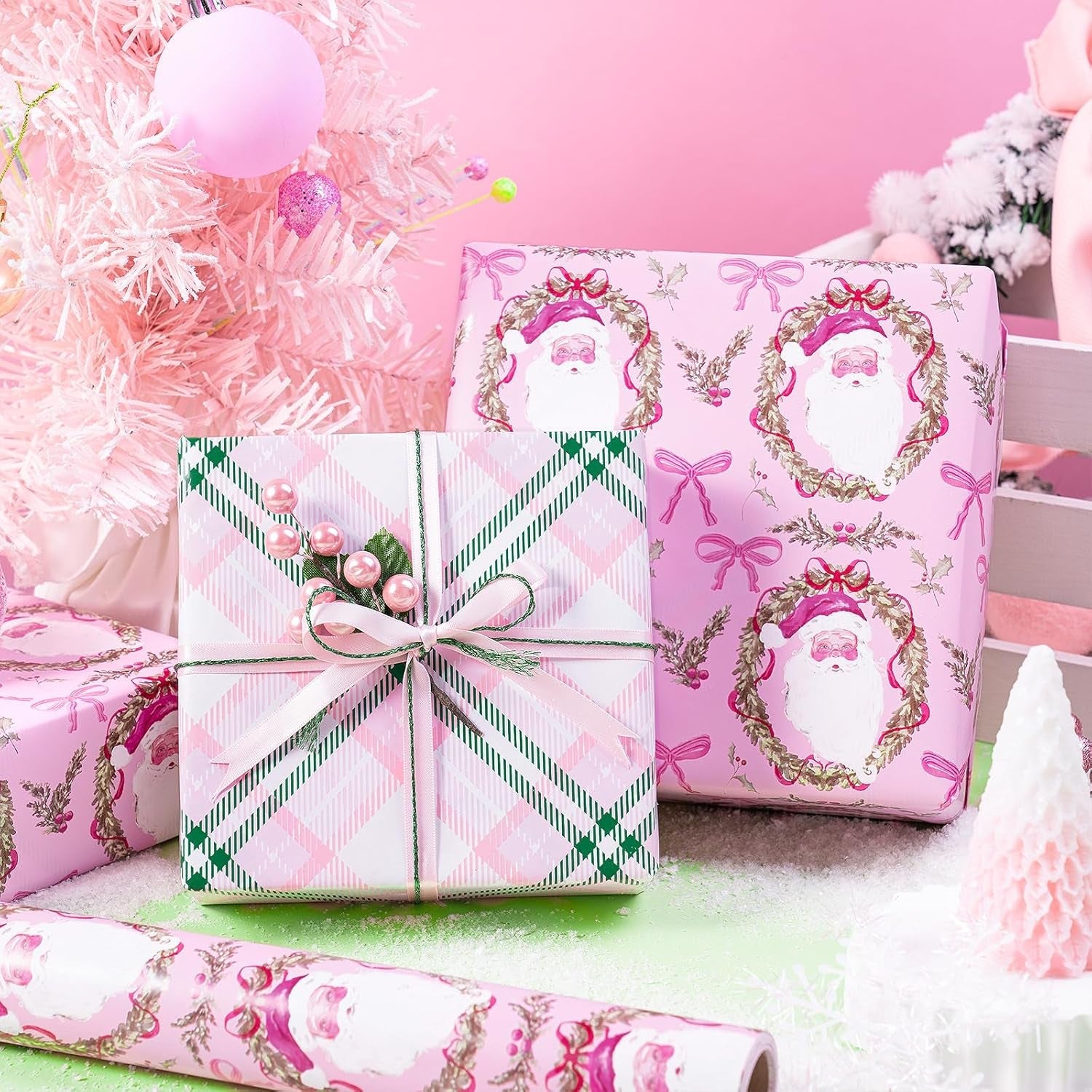 • Festive Reversible Design: One side features a playful design with a pink santa claus surrounded by floral wreaths and bows, creating a cheerful, festive look for the holidays. The reverse side offers a modern touch with a green and pink plaid pattern, giving you two beautiful wrapping options in one roll