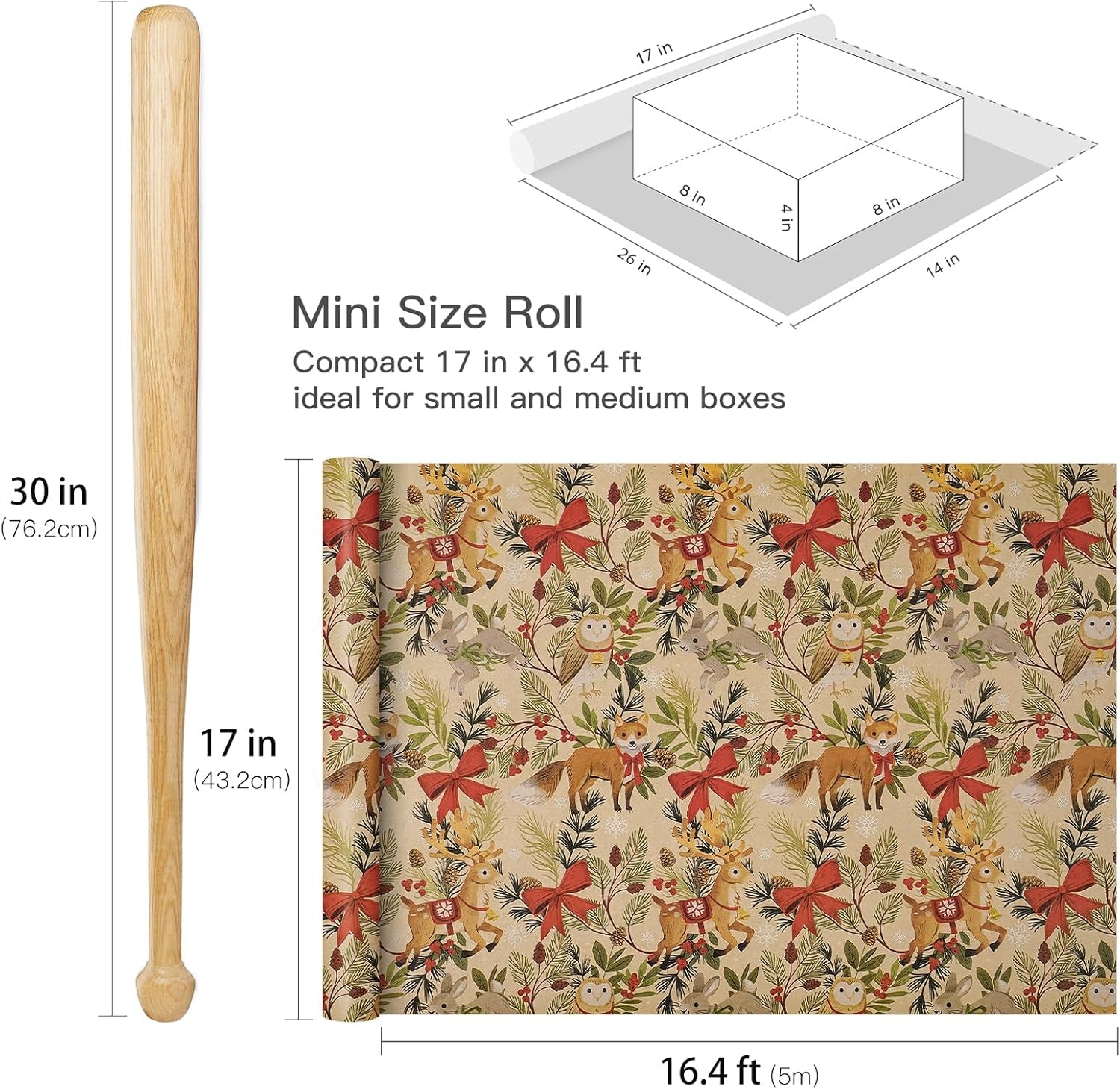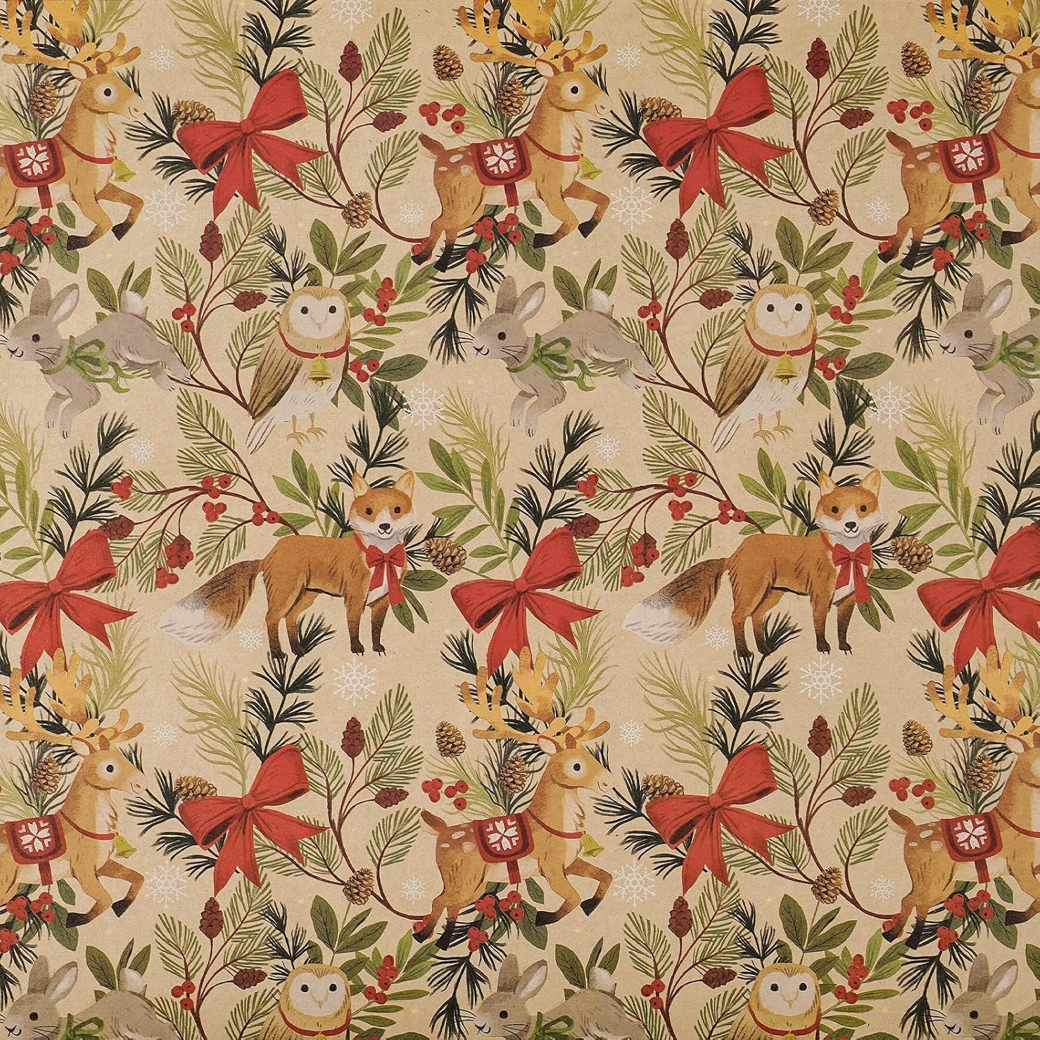 Add a whimsical woodland charm to your holiday gifts with the Christmas wrapping paper roll! This mini roll features a heartwarming design of foxes, reindeer, owls and bunnies surrounded by festive greenery, bright red bows, pinecones, berries and delicate snowflakes, all set against a rustic kraft paper background.