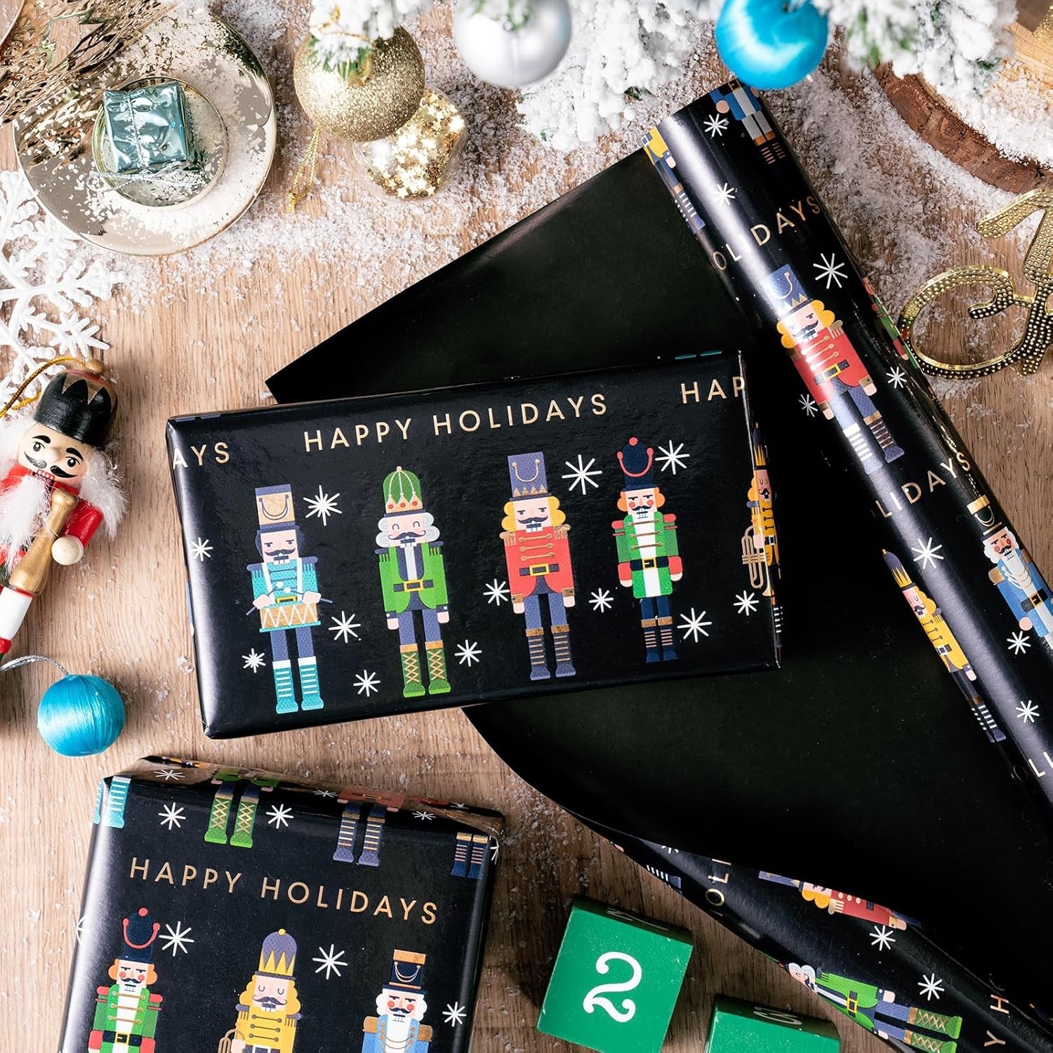 Reversible: Christmas nutcracker with snowflakes and "Happy Holiday" lettering printed on one side, solid black printed on the reverse. Two different designs make unique and varied gift presentations easy.
