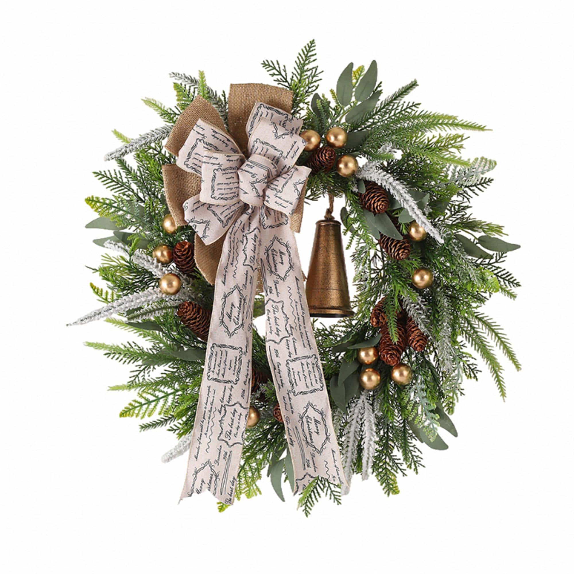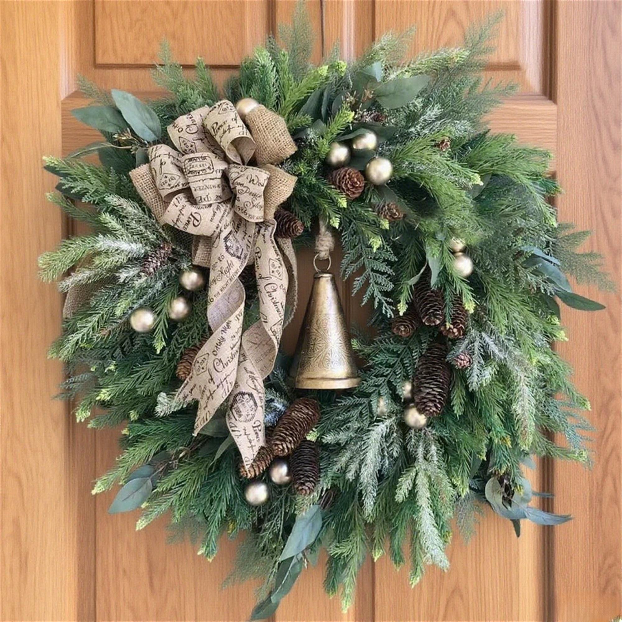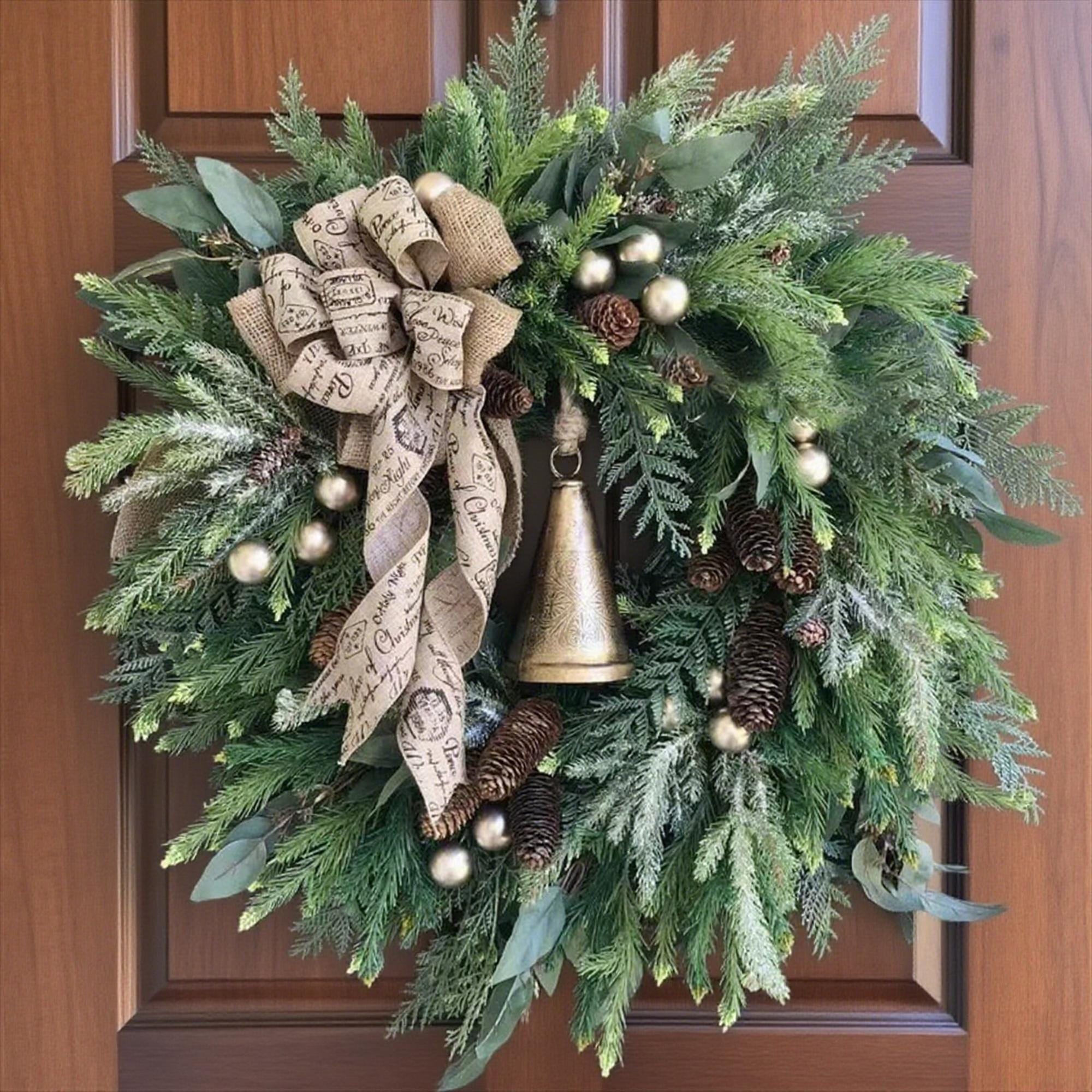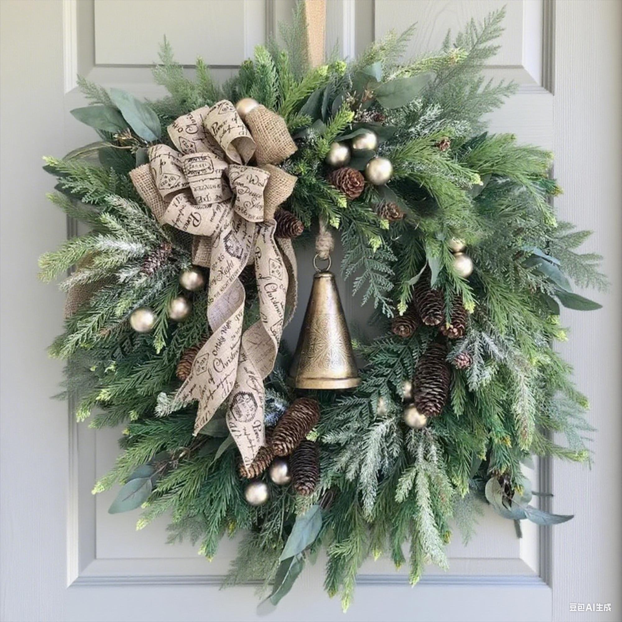 Material: Simulated Pine Branches (Plastic/Silk), Burlap Bow (Fabric), Golden Ornaments (Plastic/Metal), Pinecones (Plastic/Resin), Bronze Bell (Metal/Imitation Metallic Plastic)