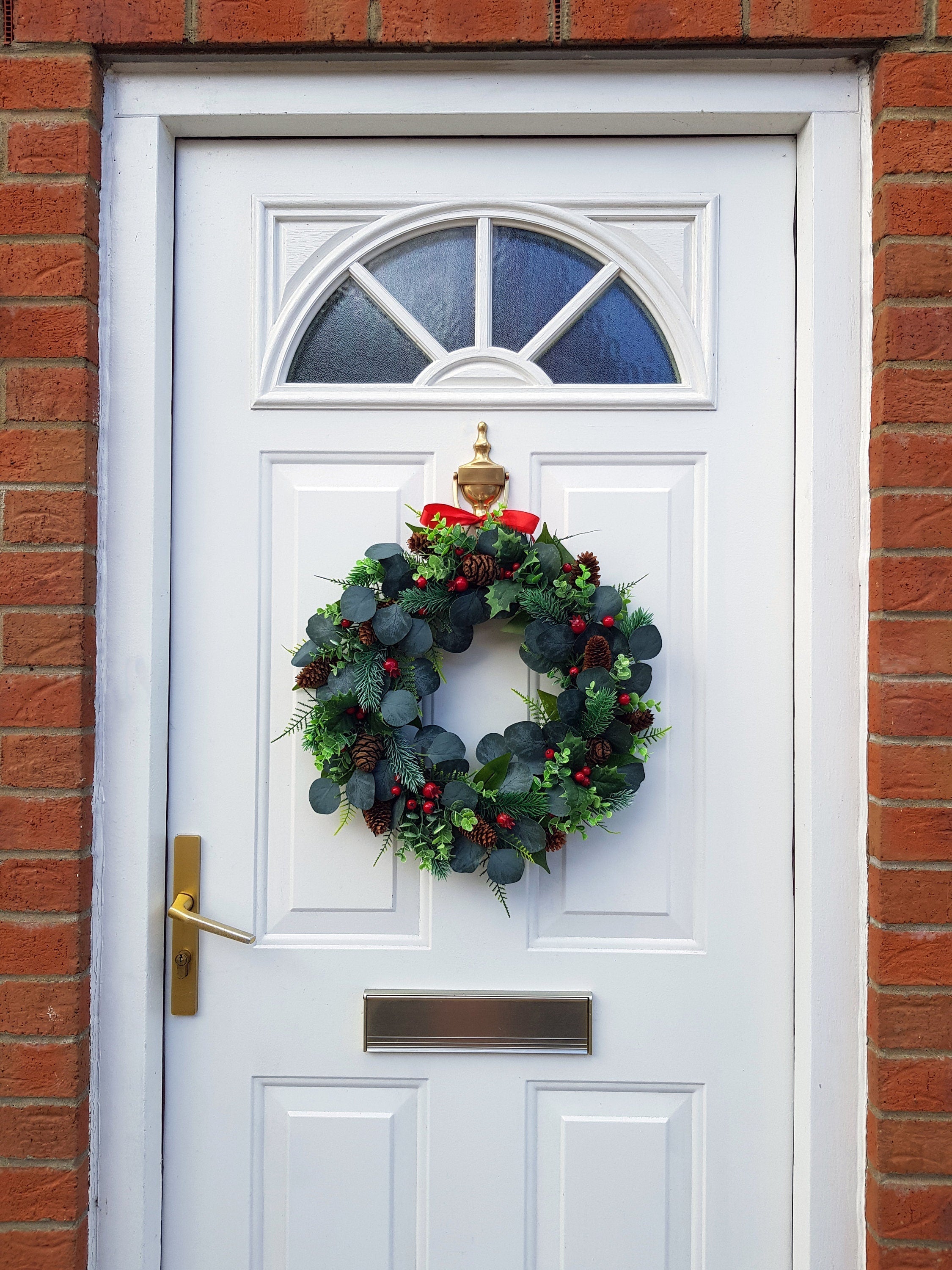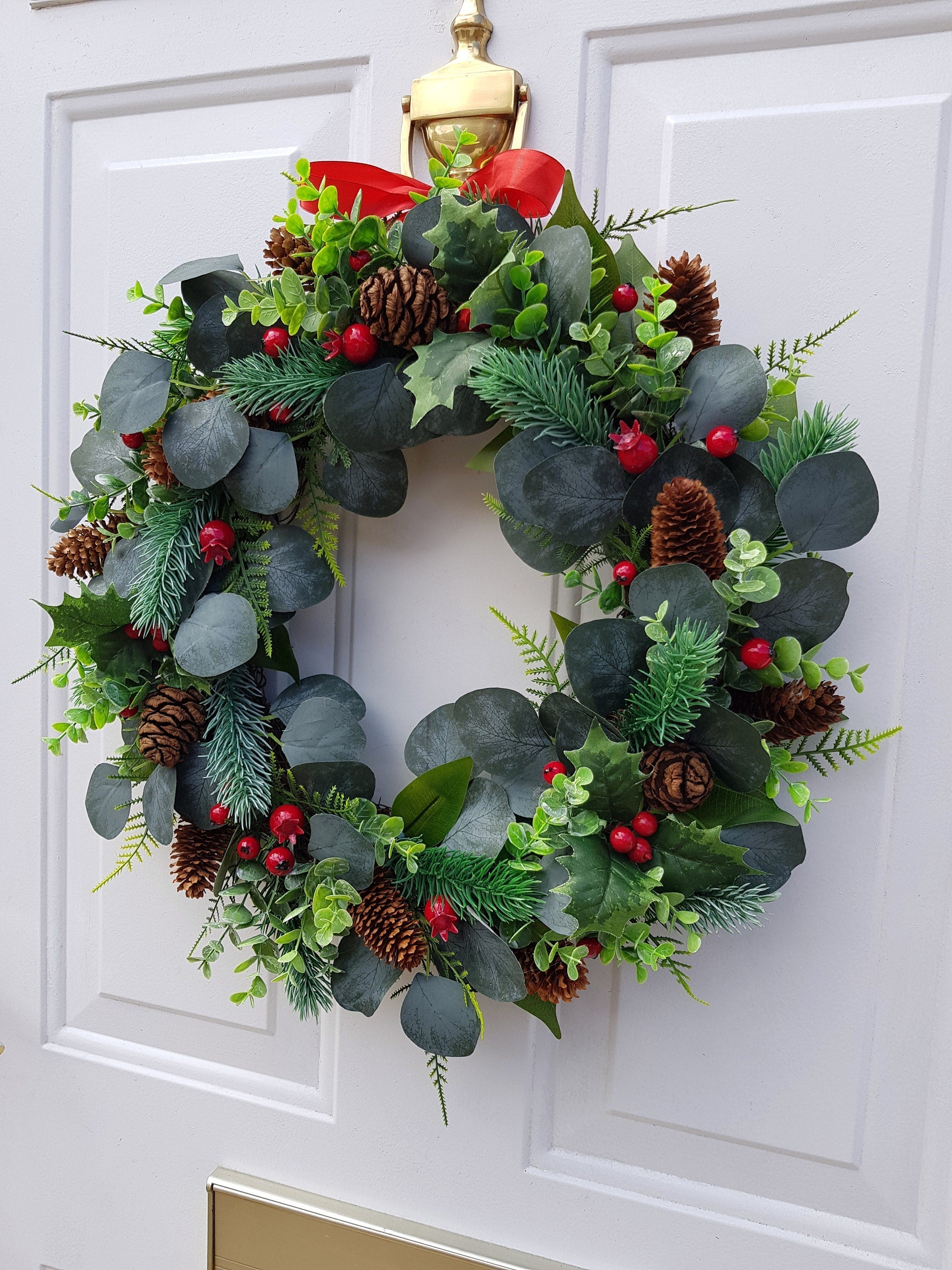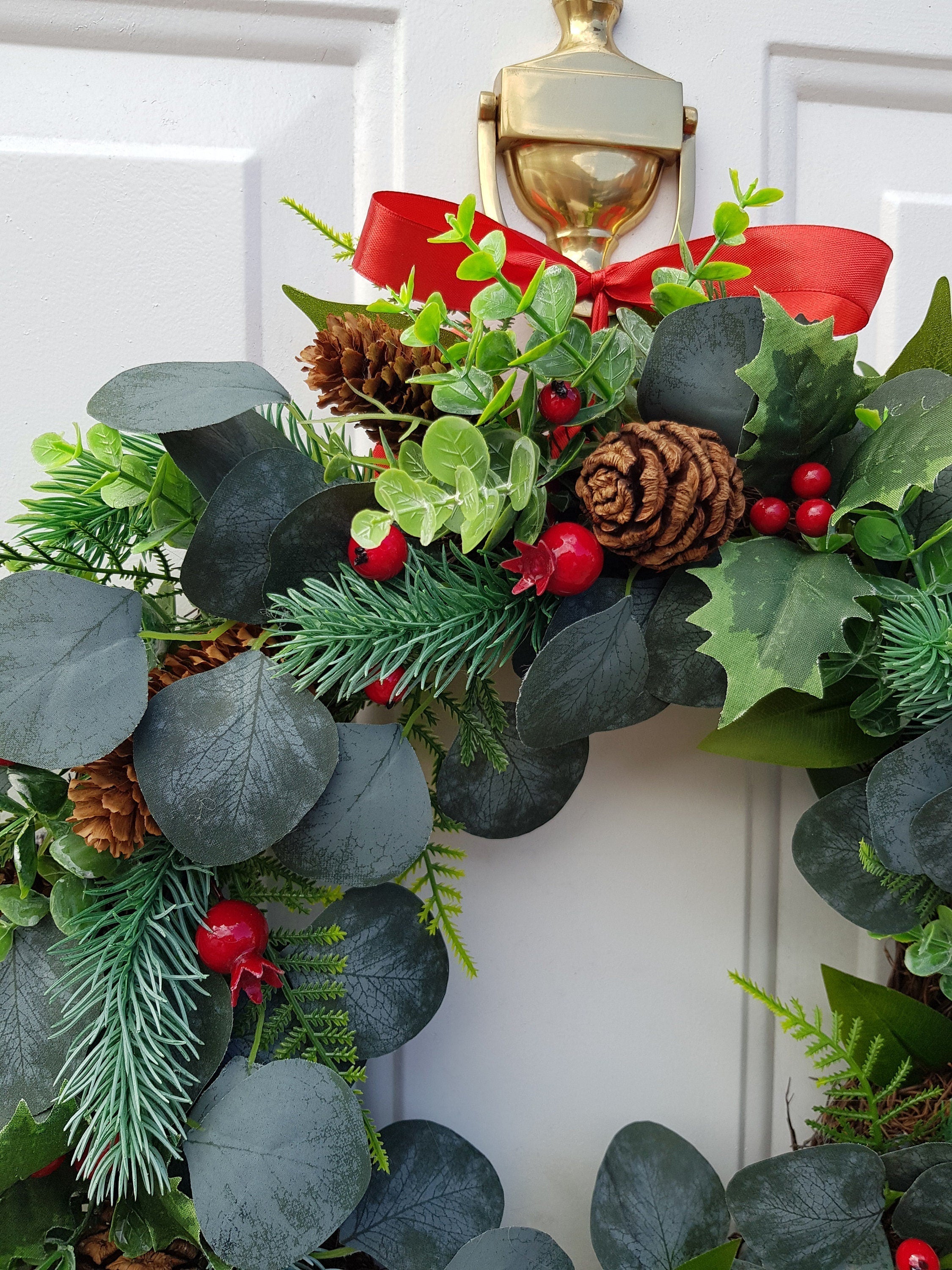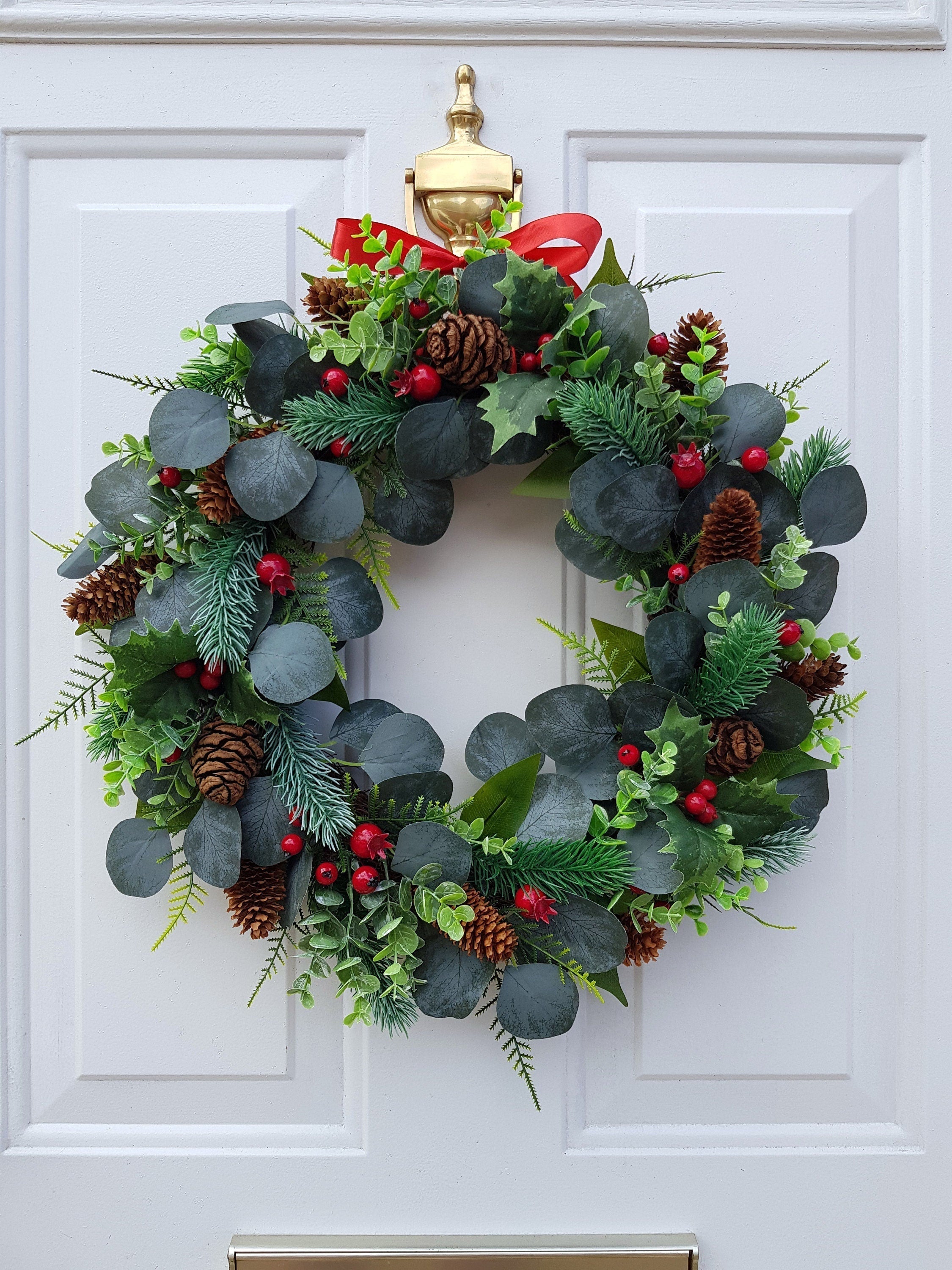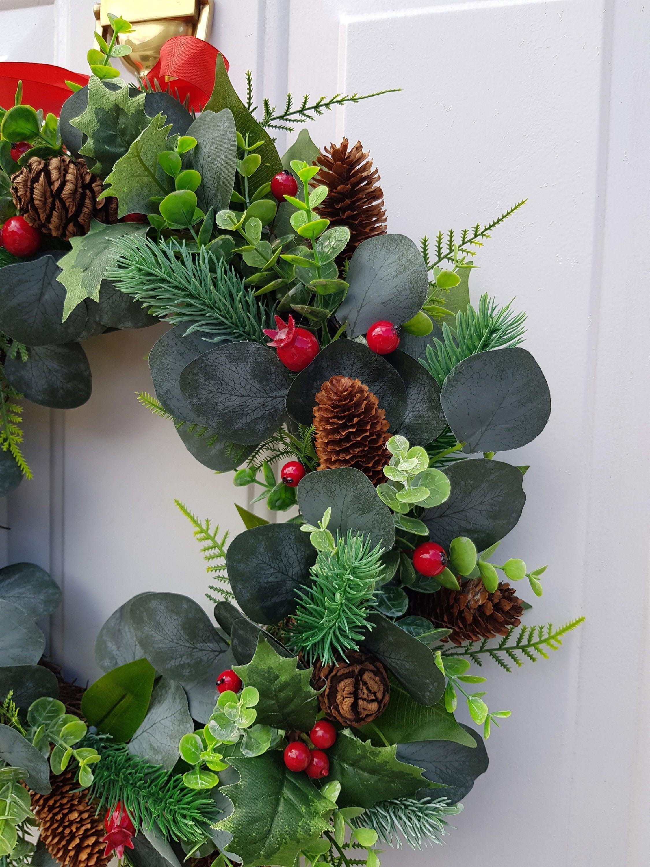 Christmas Wreath, Front Door Wreath, Handmade Wreath, Eucalyptus and Pine Cones, Artificial Berries, Woodland Wreath is backordered and will ship as soon as it is back in stock.