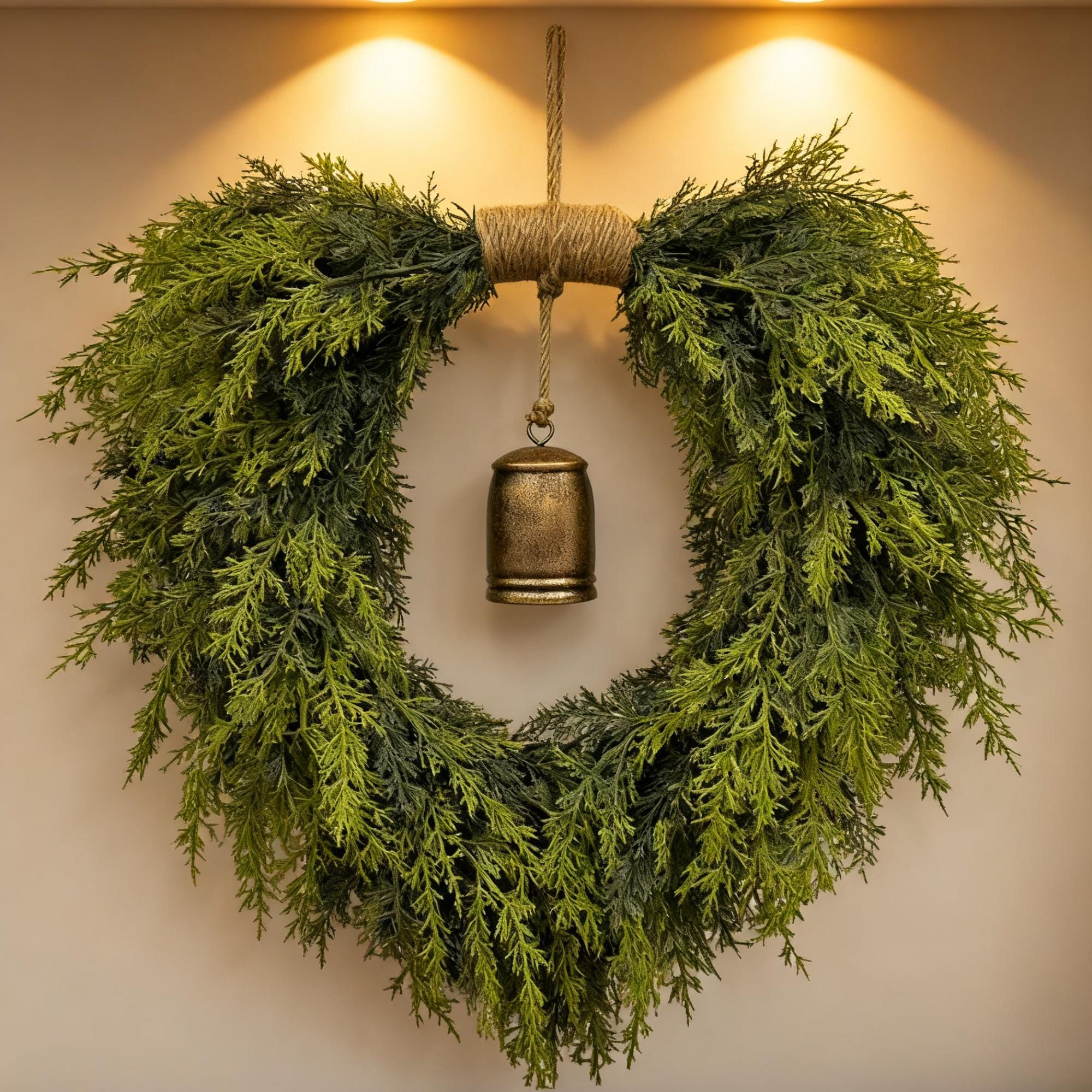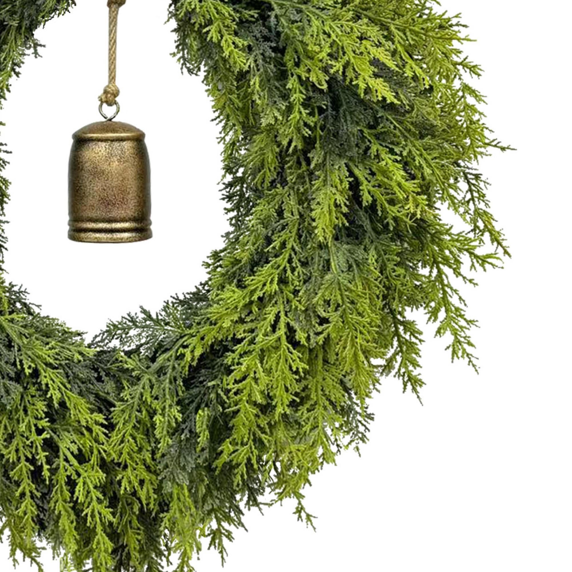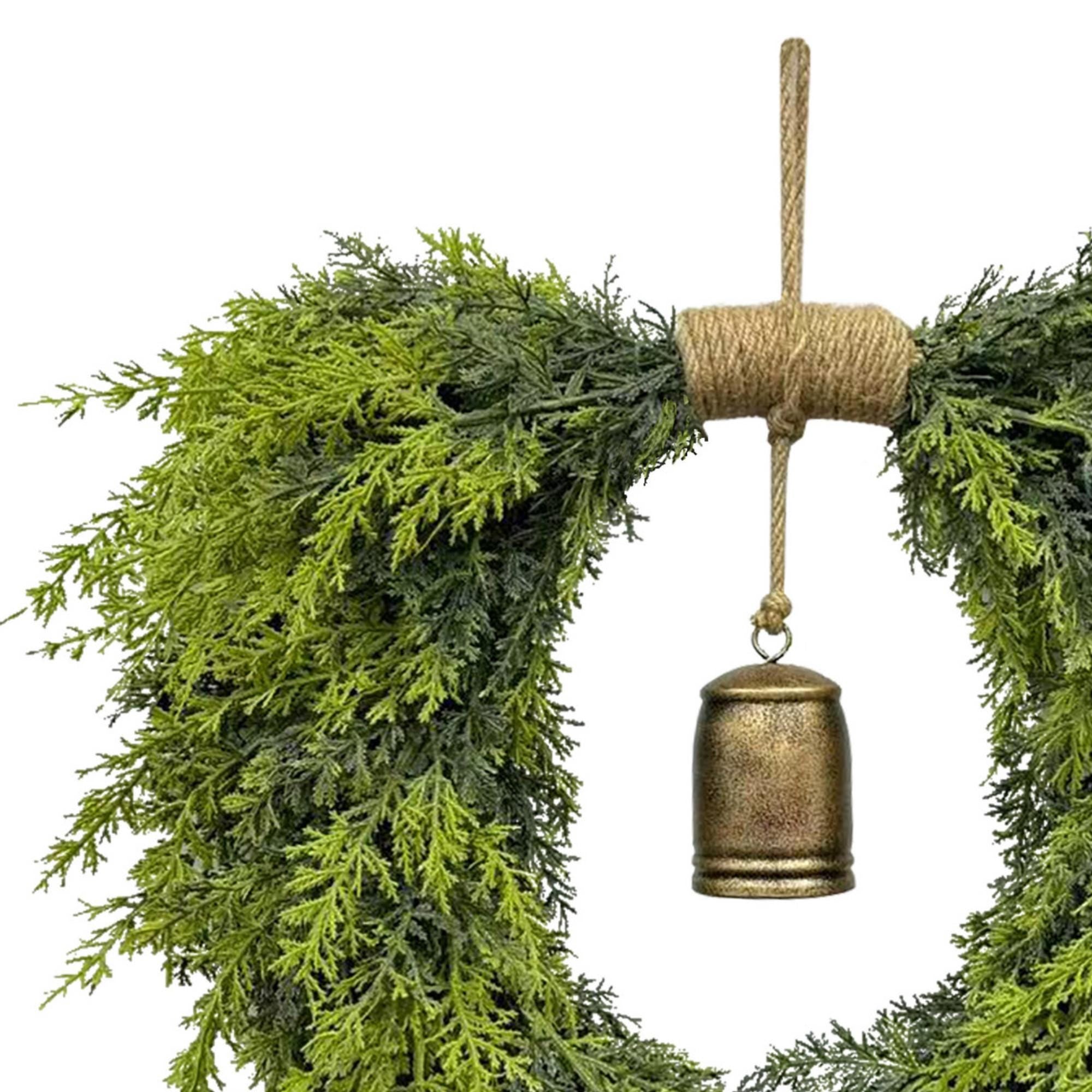 Bring timeless Christmas charm to your home with this 50CM (19.69 inches) artificial green leaf wreath. Crafted with lush, lifelike greenery for a fresh forest feel, it’s beautifully accented with vintage-style metal bells and jute rope details, creating the perfect blend of rustic elegance and festive warmth. A gentle shake releases the soft jingle of bells, instantly evoking cozy holiday cheer. Whether gracing your front door to greet guests or enhancing walls and mantel displays, this wreath adds a unique and captivating touch to your seasonal decor.