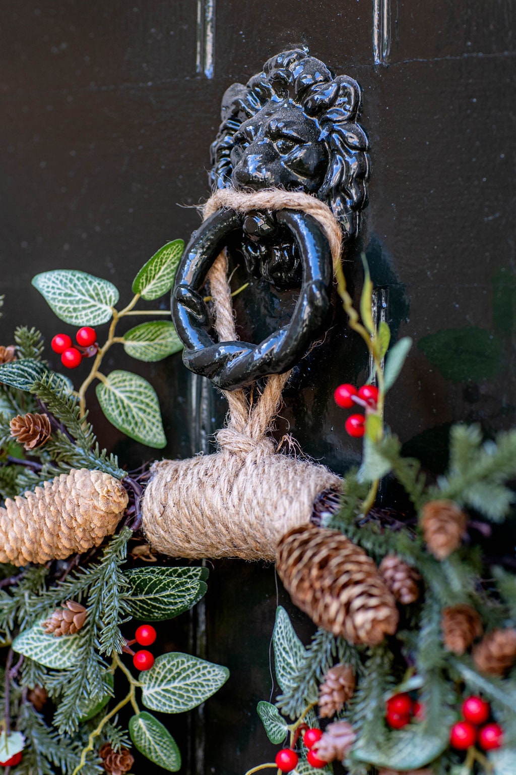A full luxury faux door wreath in a modern teardrop style with rustic rope hanging feature - a real statement piece!