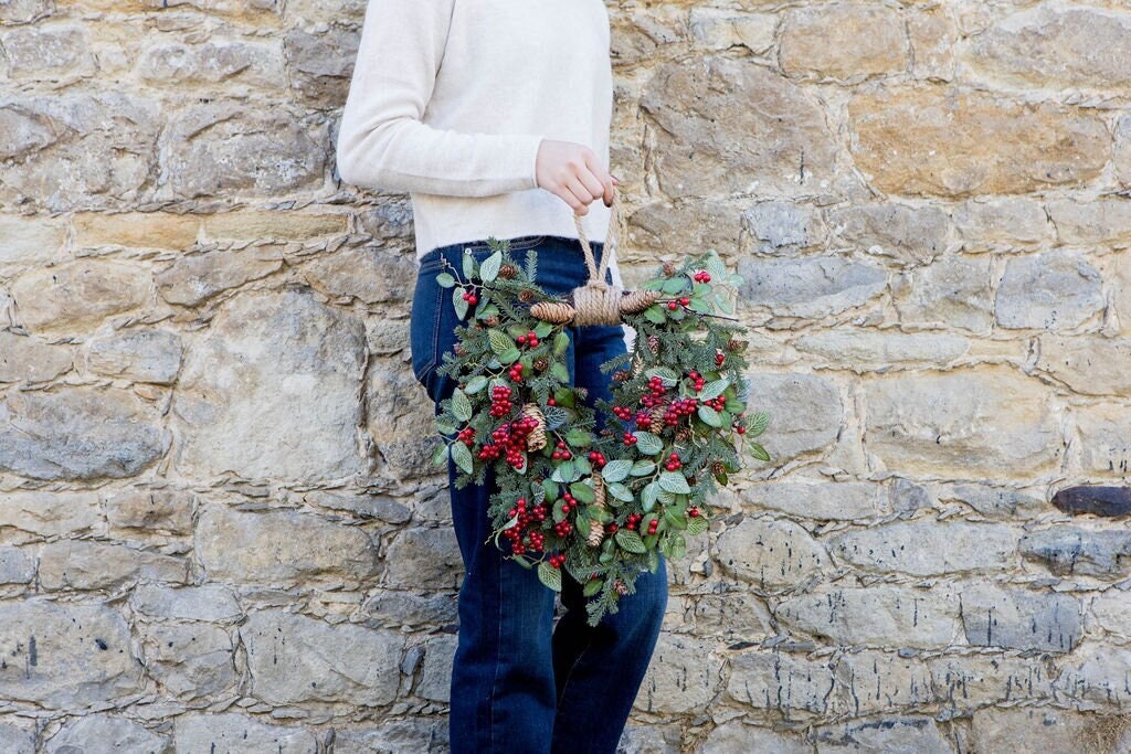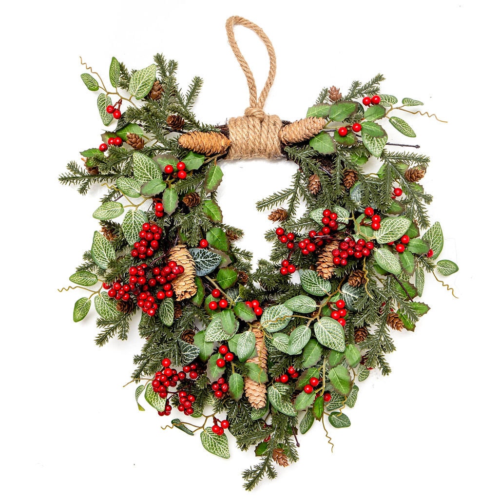 Created using faux pine and winter foliage with deep red glossy berries and a rustic rope handle giving it a highly realistic Christmas look.