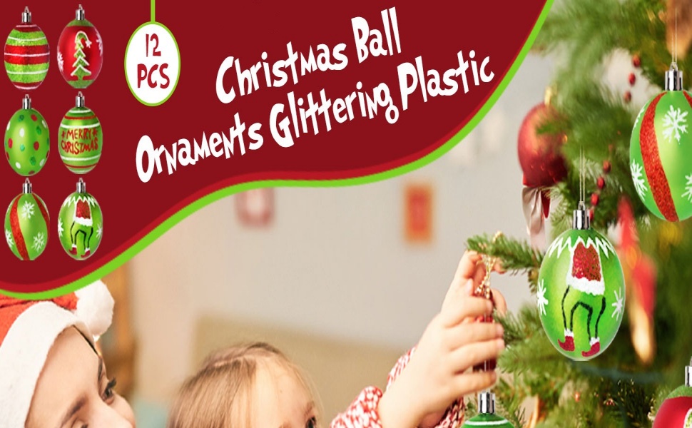 12Pcs Christmas Ball Ornaments for Tree, Grinch Red and Green Glittering Hanging Bulbs Pendants for Christmas Tree Decorations, 2.4 Inch / 6cm