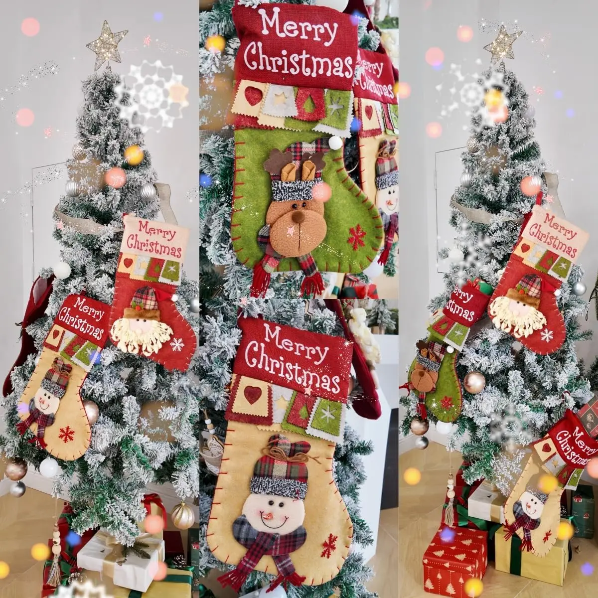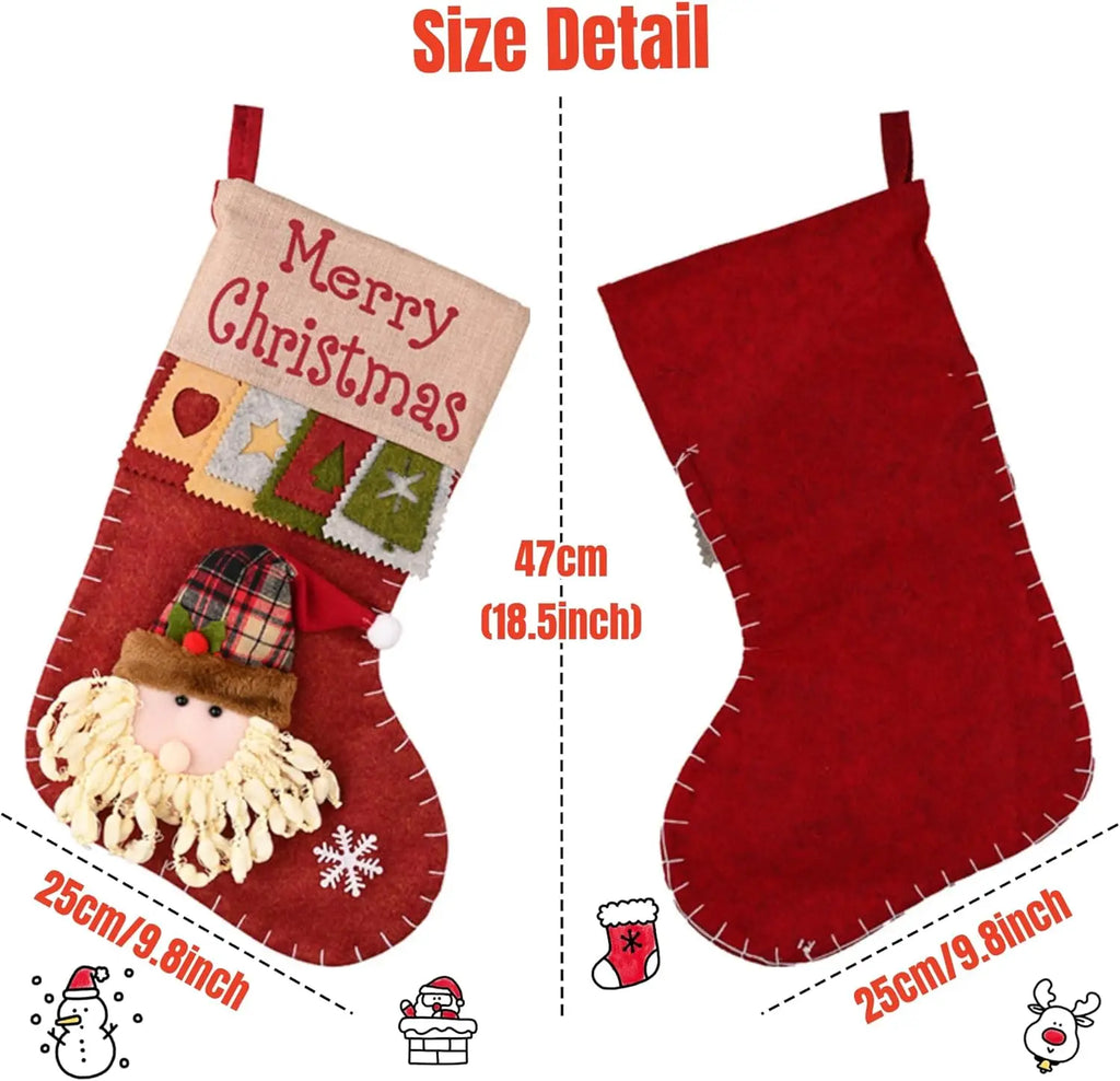 Classic Style: Cute stockings with Santa, Snowman and Reindeer. They will definitely look great when hanging to tree. Perfect decoration for home, restaurant, club, bar.