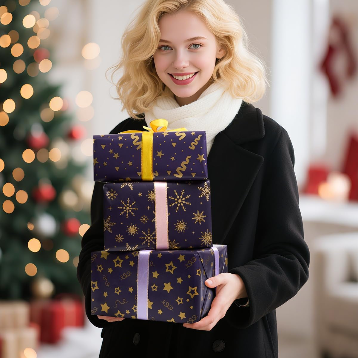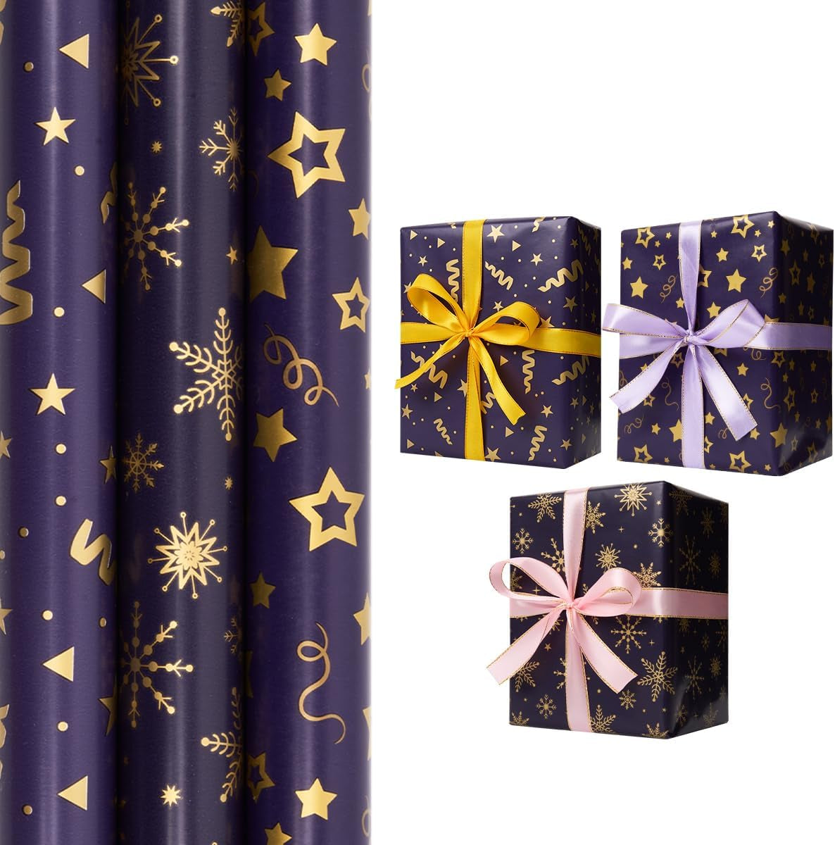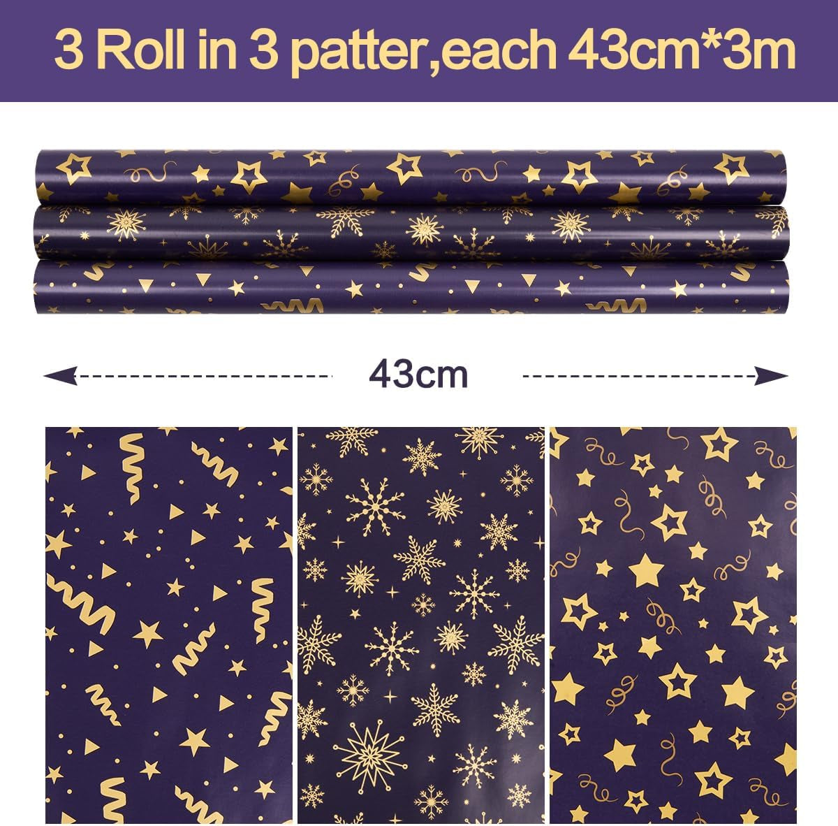 3 Rolls Blue Gold Gift Wrapping Paper, 43Cm*3M Wrapping Paper Print with Star and Snowflake for Christmas, Birthday, Festival Party Gift Decoration - Blue Gold is backordered and will ship as soon as it is back in stock.