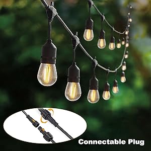 • Connectable 100FT Outdoor Garden Lights】The outdoor string lights with 30 hanging sockets, 3.1FT apart for per bulb. A total of 30+2 S14 bulbs. The end of each light string has an end-to-end connection port so that you can connect multiple string lights to your favorite length. Connections: Up to 10 strands total.