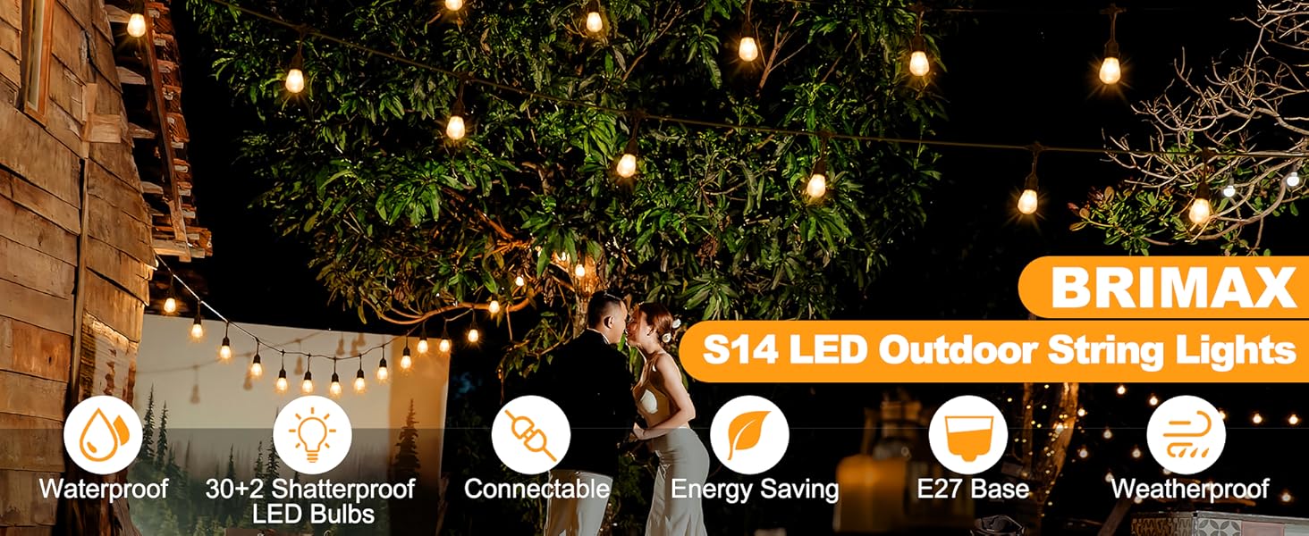 • Shatterproof&Weatherproof】30+2 Pcs S14 Shatterproof LED filament bulbs included, BRIMAX outdoor string lights are built with weatherproof technology and the insulation material which protect the strand from ommon climates. Flexible heavy-duty cord withstands the wear of indoor and outdoor use. LED string lights with the plastic bulb housing are durable, safe and reliable.These 2w E27 S14 led plastic bulbs will not break even when dropped from high places.