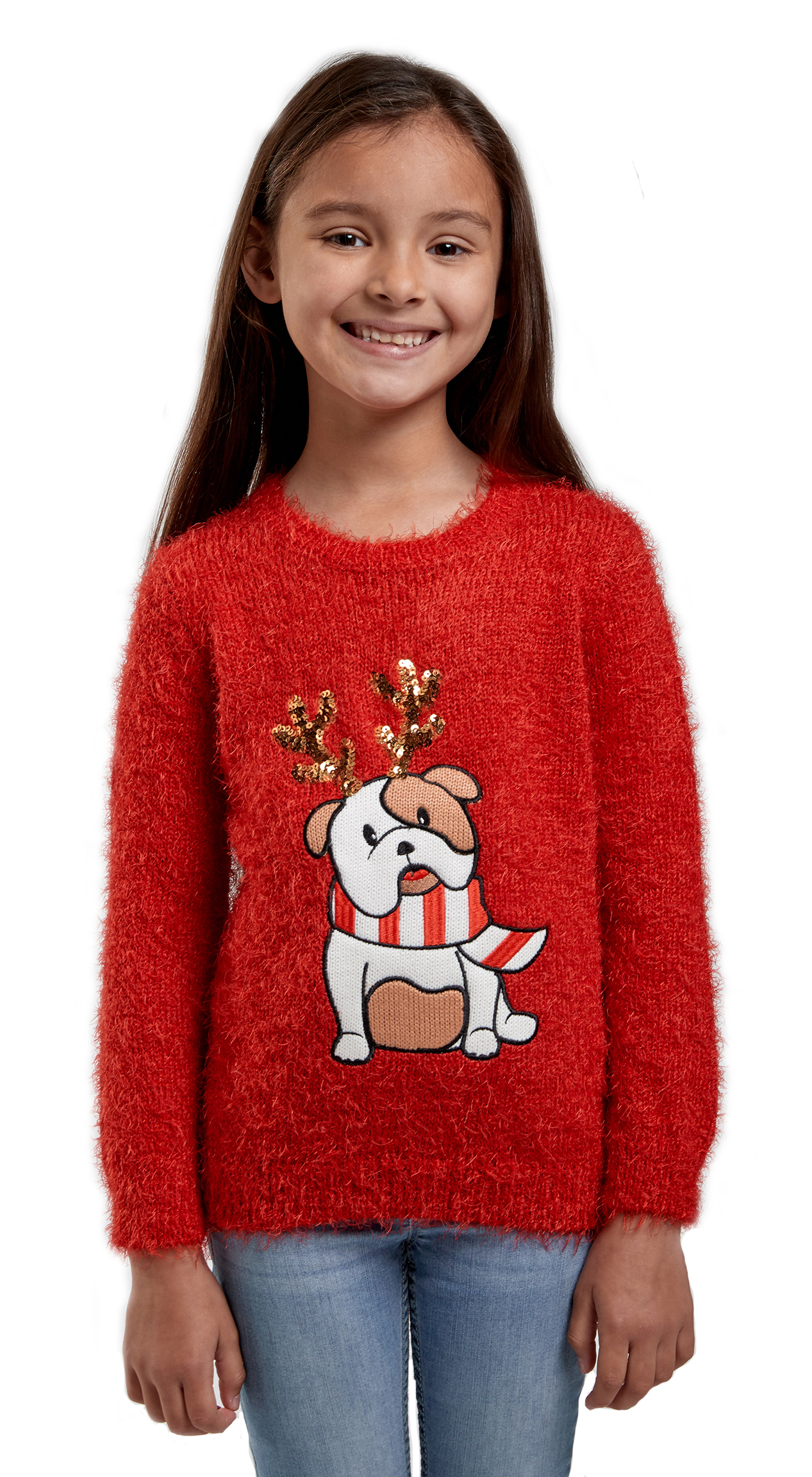 Christmas Jumper Kids Girls Cute Bull Dog Xmas Knit Sweater Pullover Red