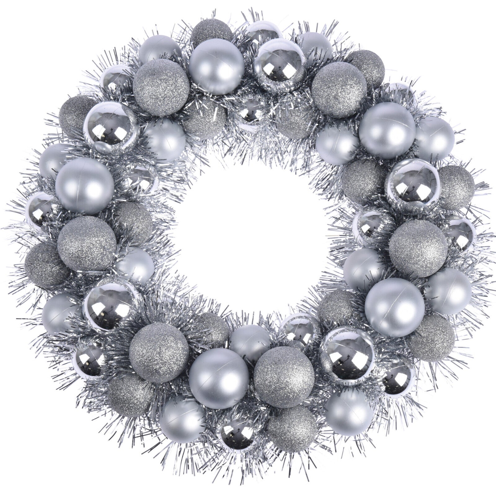 Add a sparkling touch to your festive Christmas decoration with this tinsel wreath. Designed around a plastic frame/ring featuring sparkling tinsel and a decoration of 56 matte, shiny and glitter baubles is this Christmas Wreath for you to place around your home and bring joy. It’s a great welcoming decoration to create a lively Christmas atmosphere and be placed on doors i.e. front doors, hallway entrances, living room, fireplaces, windows, offices & more.