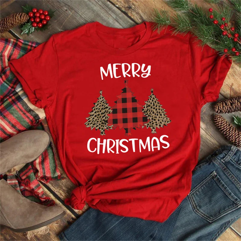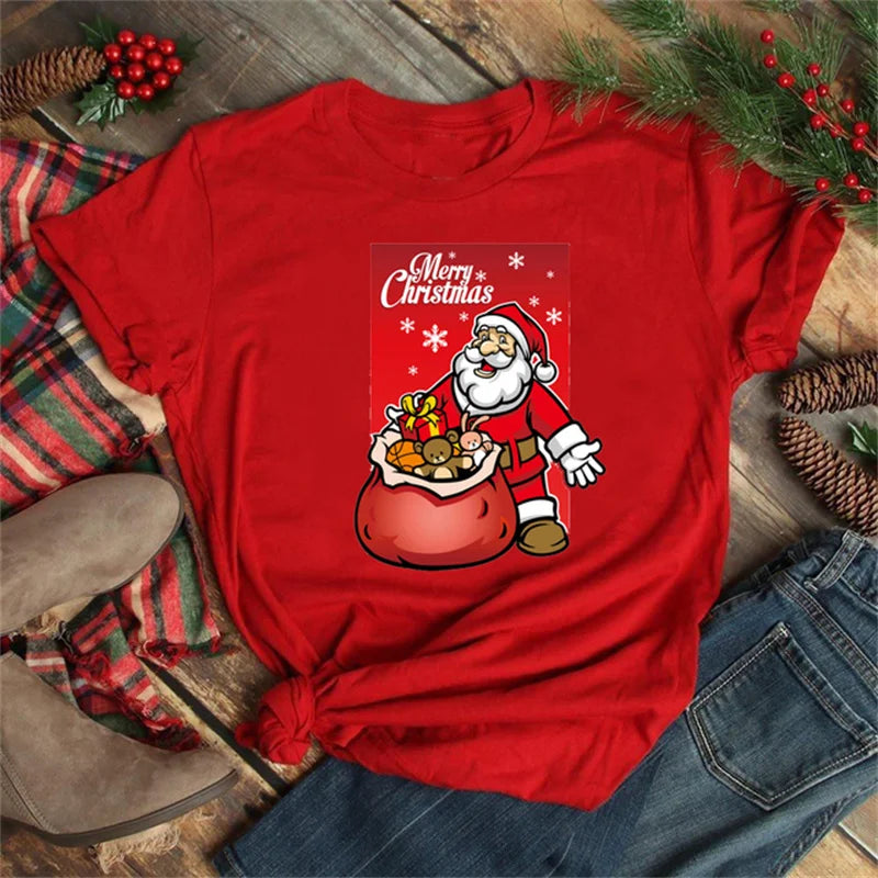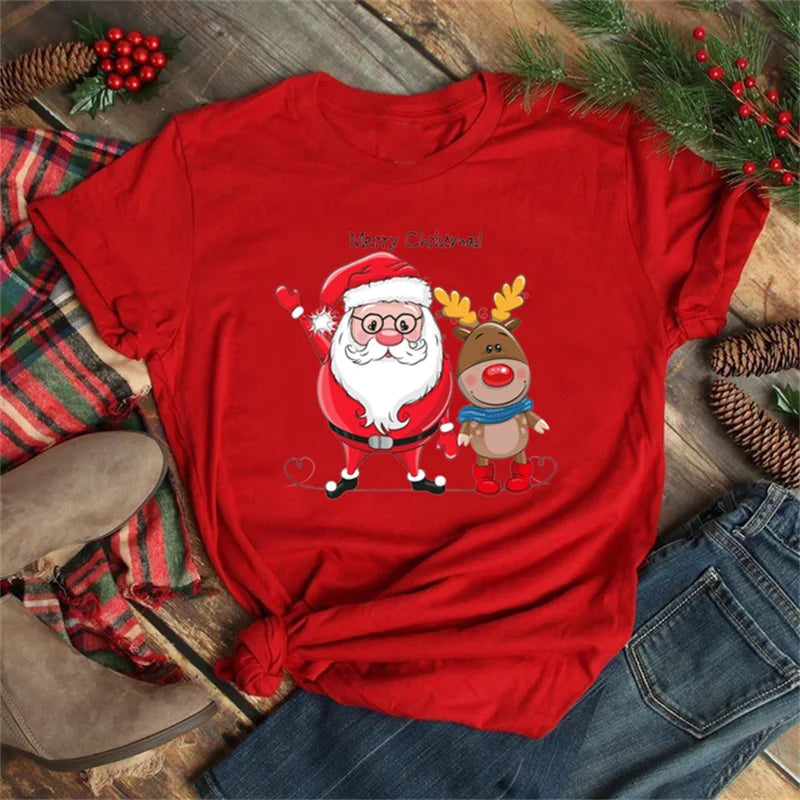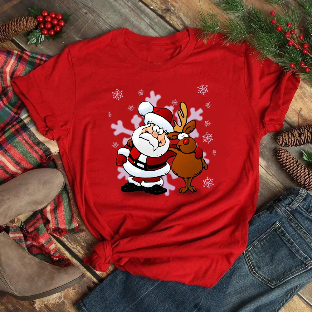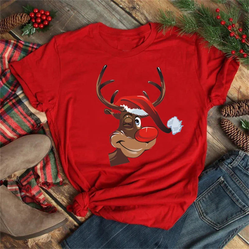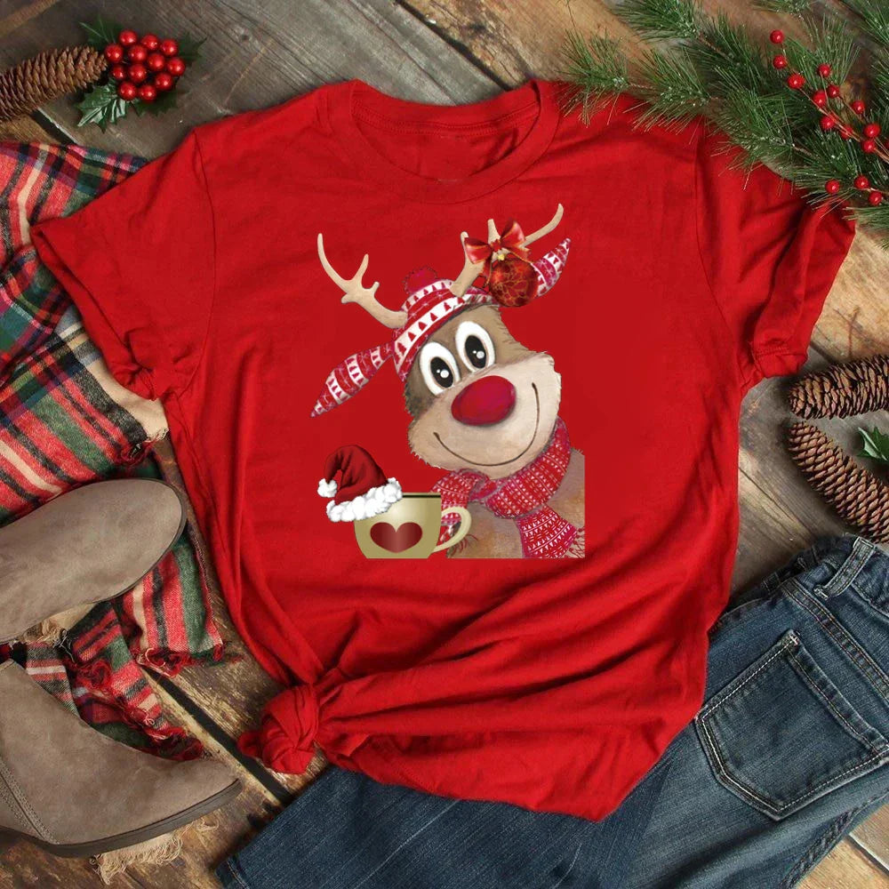 Funny Christmas Elk Printing Print Women T Shirt - Red-D1377L / L is backordered and will ship as soon as it is back in stock.