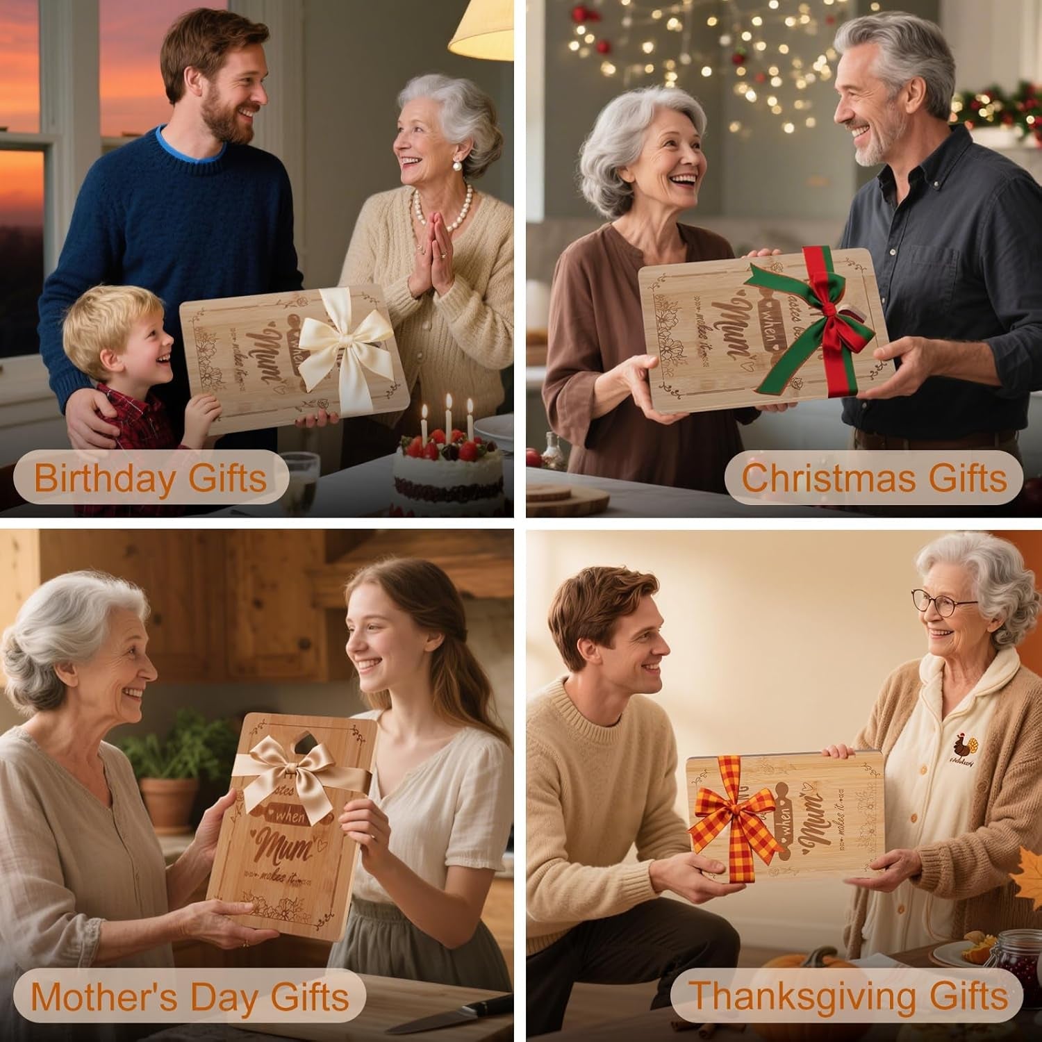 [ Best Gifts for Mum ]: Our bamboo chopping boards are a thoughtful and practical gift for mums who love cooking. This cutting board, engraved with heartfelt words, makes an excellent gift choice for Mother's Day, Christmas, or birthdays. Perfect for any occasion, it's a gift that keeps on giving in the kitchen.