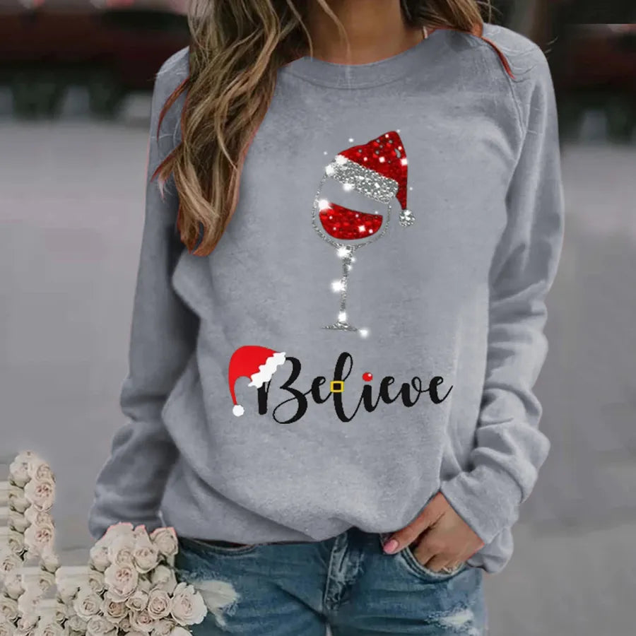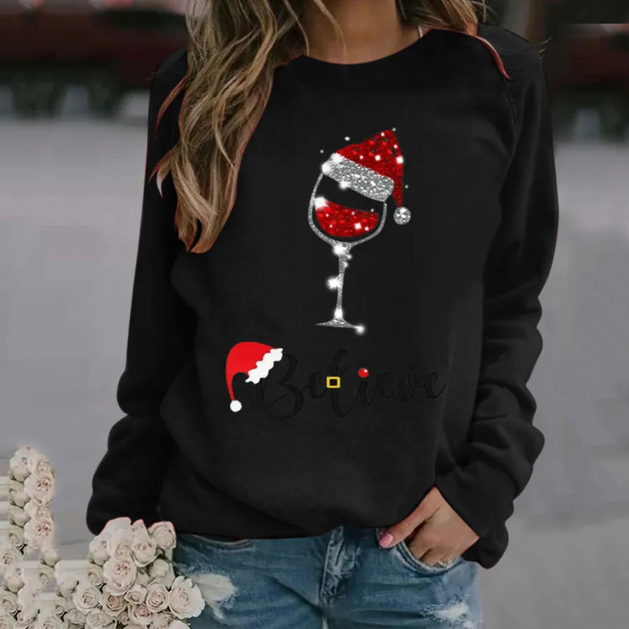 Hoodies & Sweatshirts Long Sleeve Printing Christmas Christmas Hat Letter Wine Glass