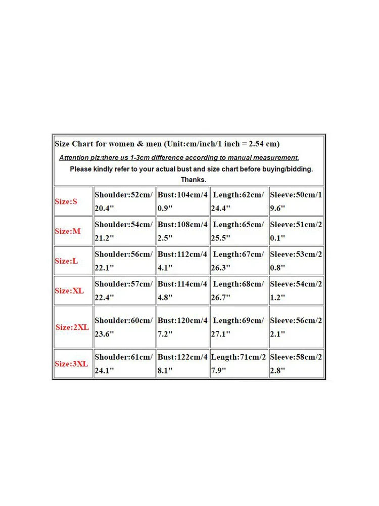 Size:3XL Shoulder:61cm/24.1" Bust:122cm/48.1" Length:71cm/27.9" Sleeve:58cm/22.8"