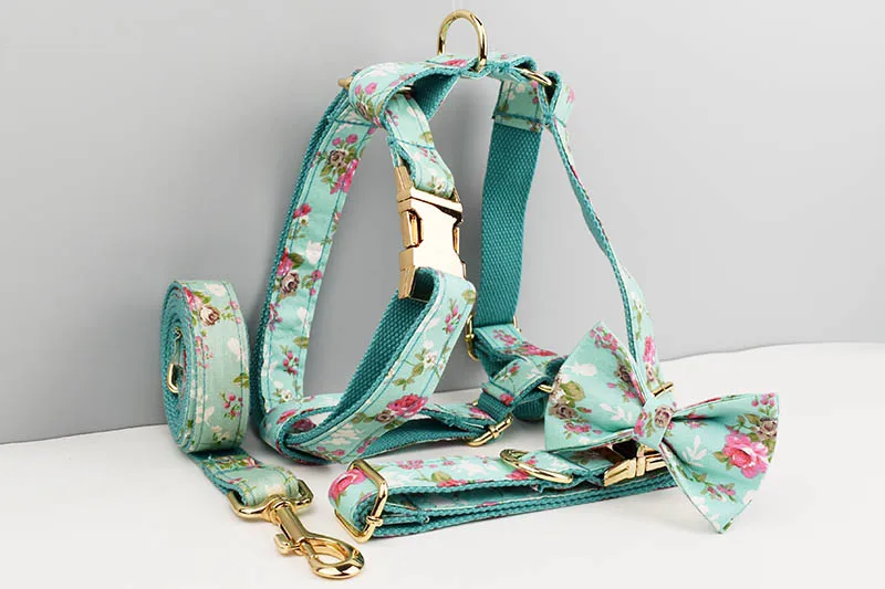 Personalized Dog Collar Harness Leash Set Custom Dog Collars Luxury Flower Soft Cotton Dog Collar Leashes Harness Bow flower08