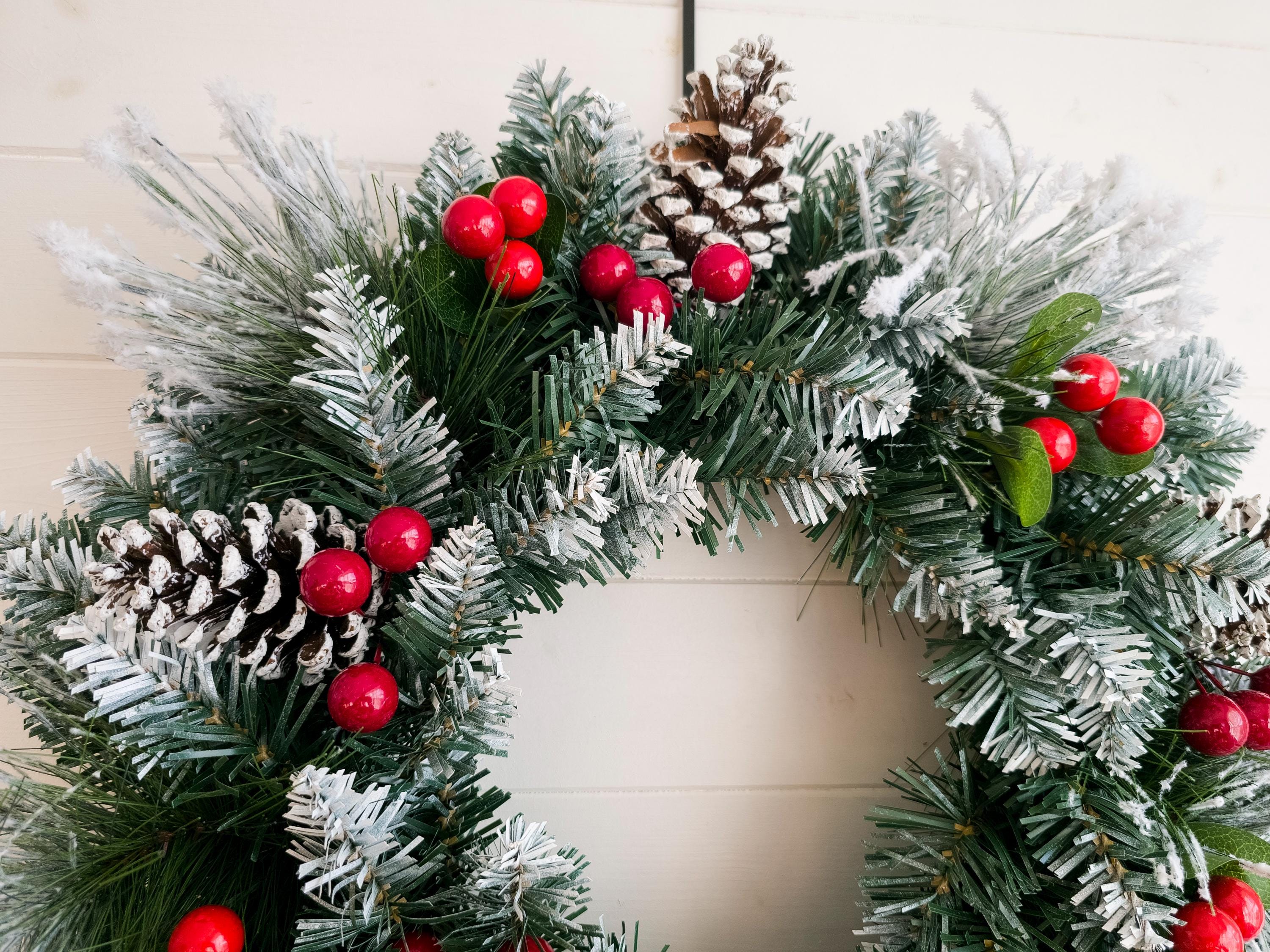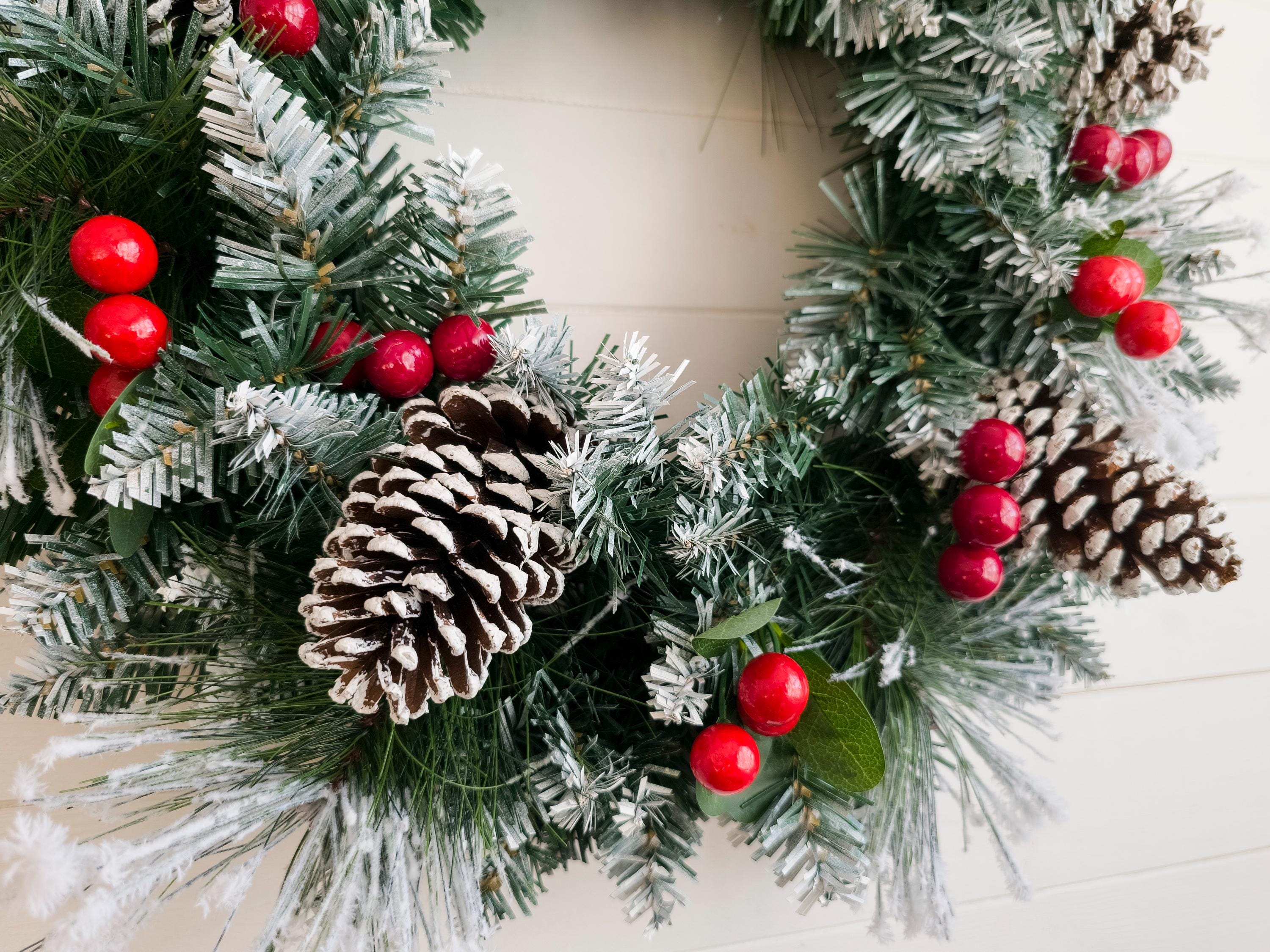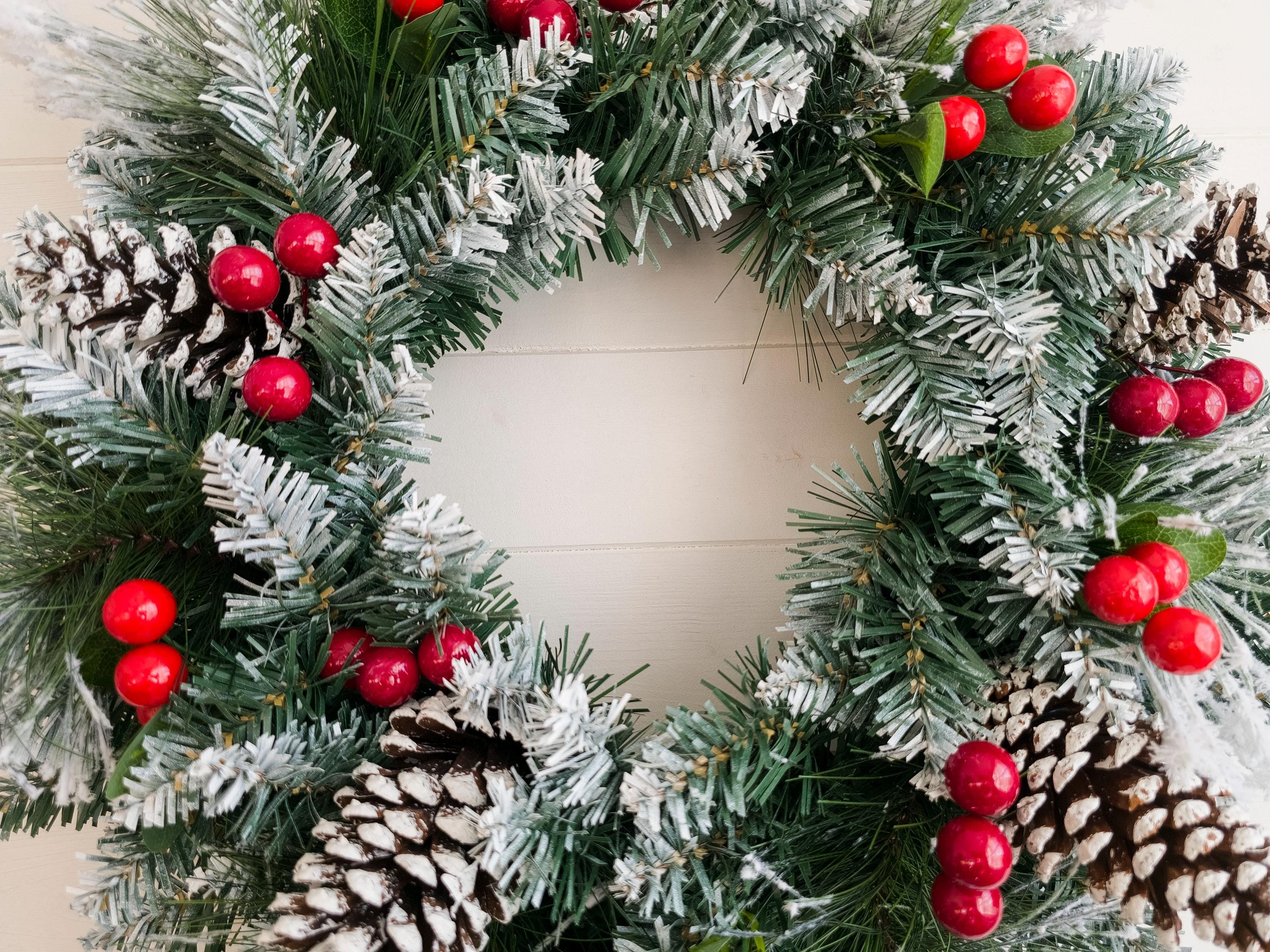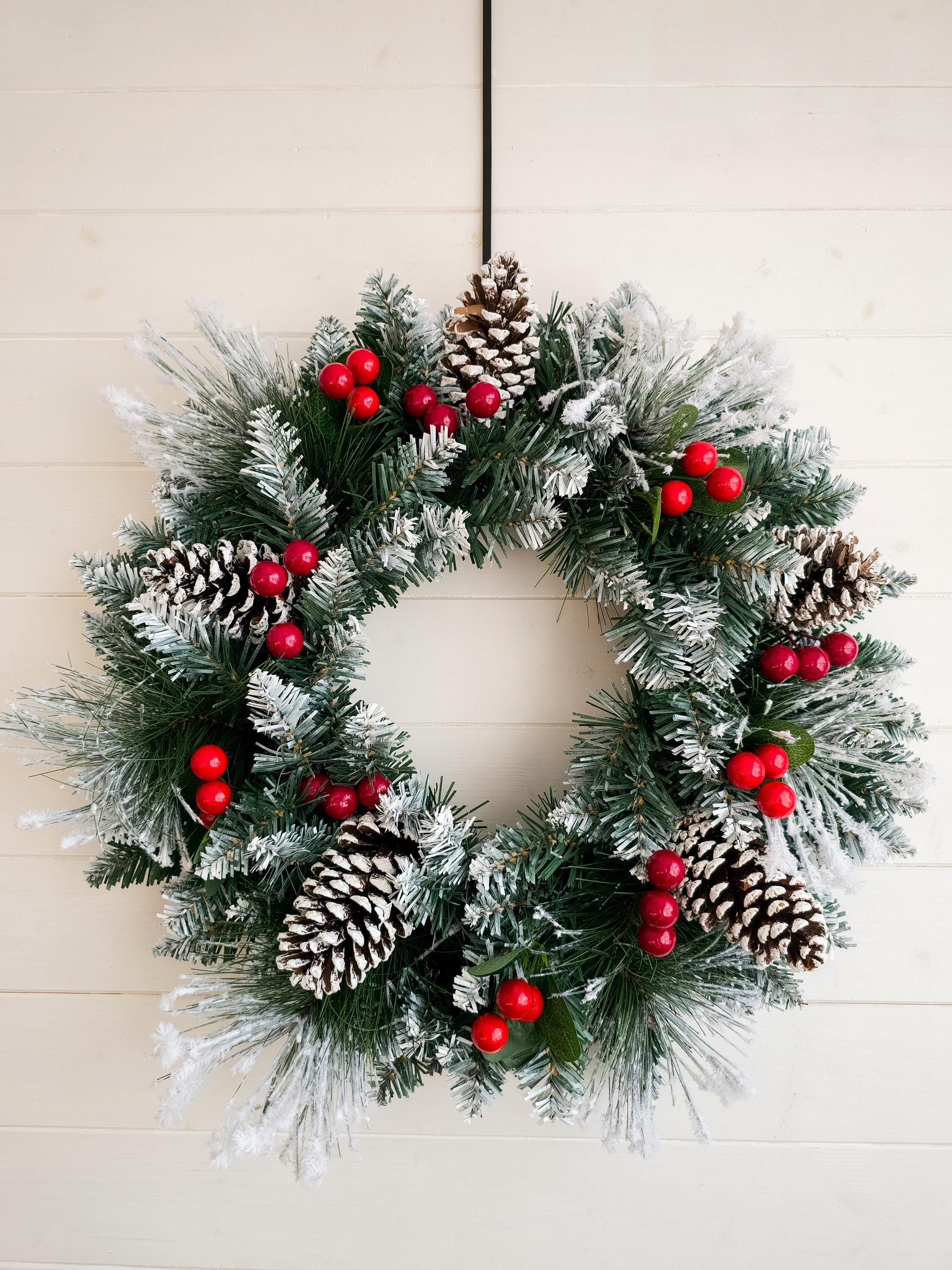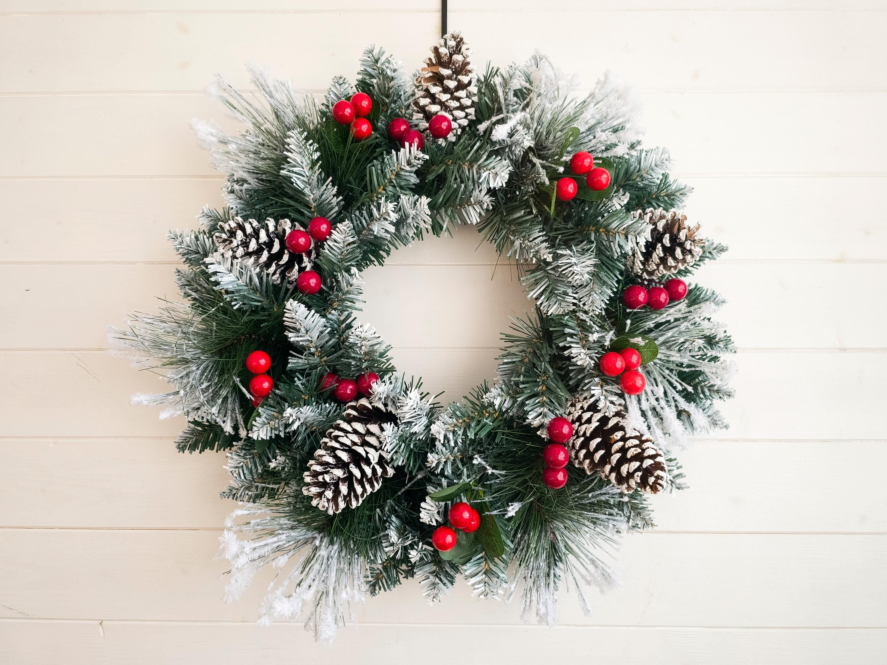 A beautifully crafted Snowy Christmas Wreath for your front door, featuring lush winter foliage, vibrant red berries, and charming pinecones, all dusted with a gentle layer of snow for a festive touch.