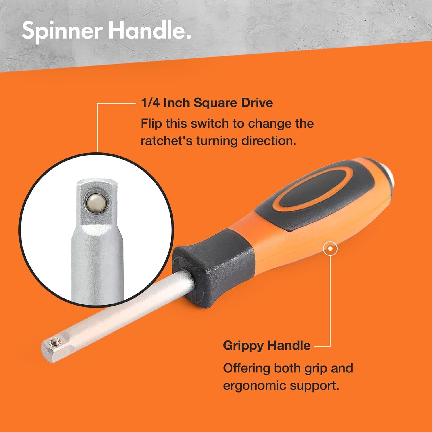 Includes a ratchet handle, spinner handle, extension, bit adapter, plus a range of sockets and bits.