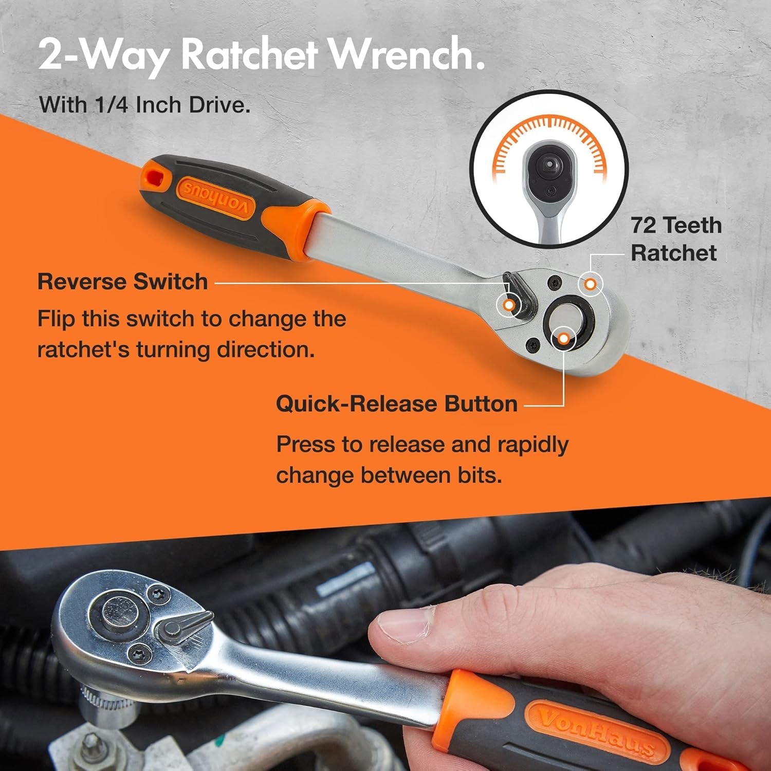• PREMIUM QUALITY: Your VonHaus socket set is constructed of robust tempered carbon steel with chrome vanadium on selected parts, so you can have peace of mind that your tool set will see you through many jobs.
