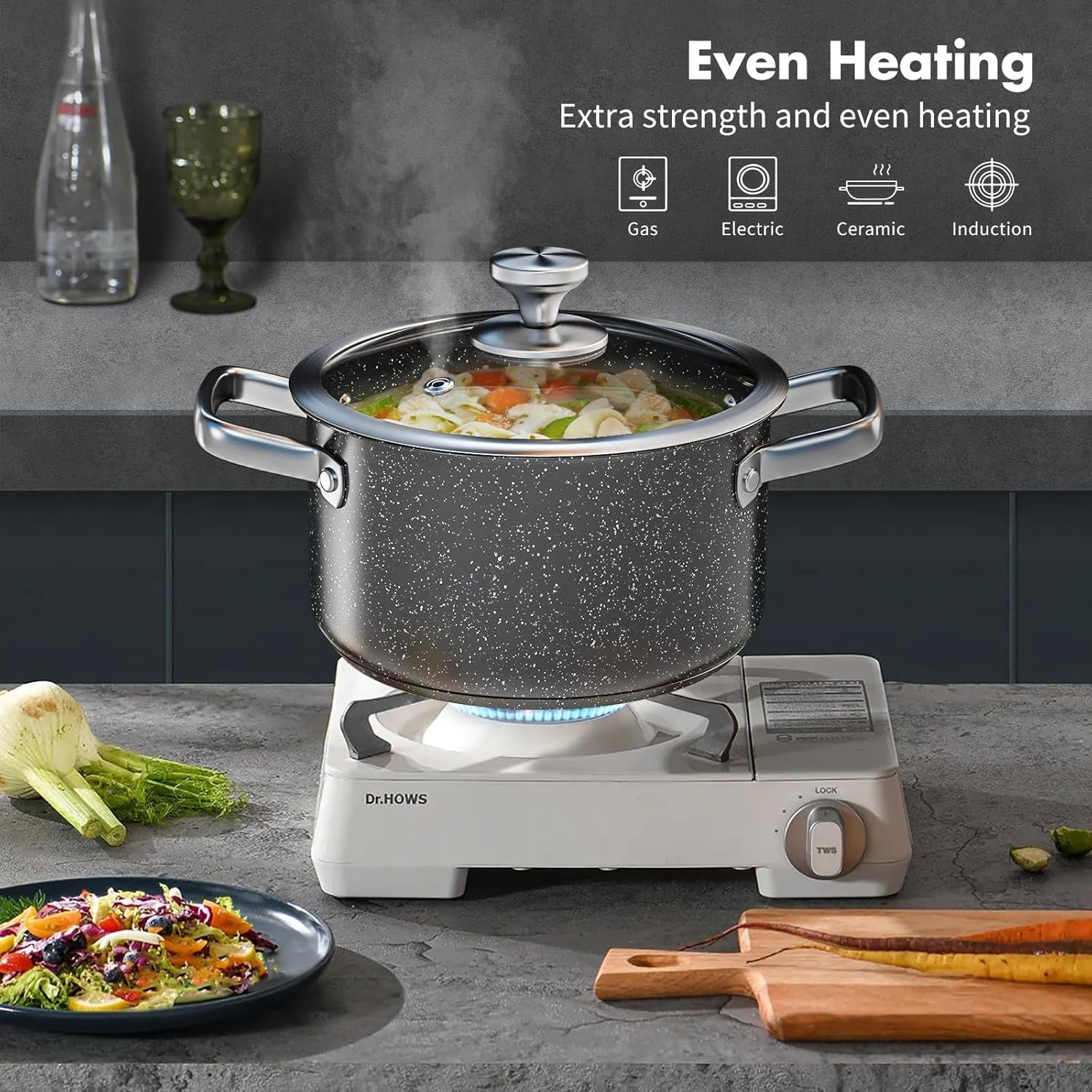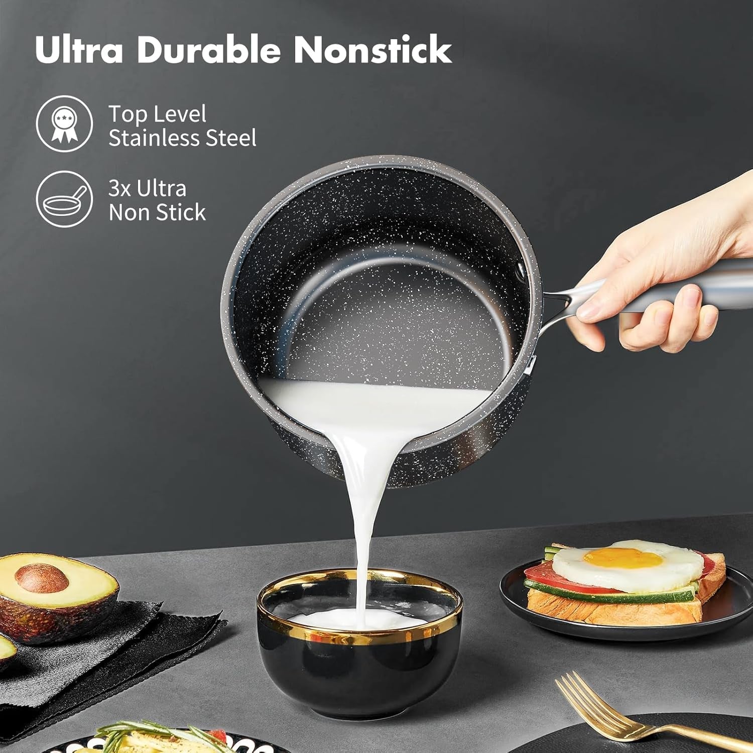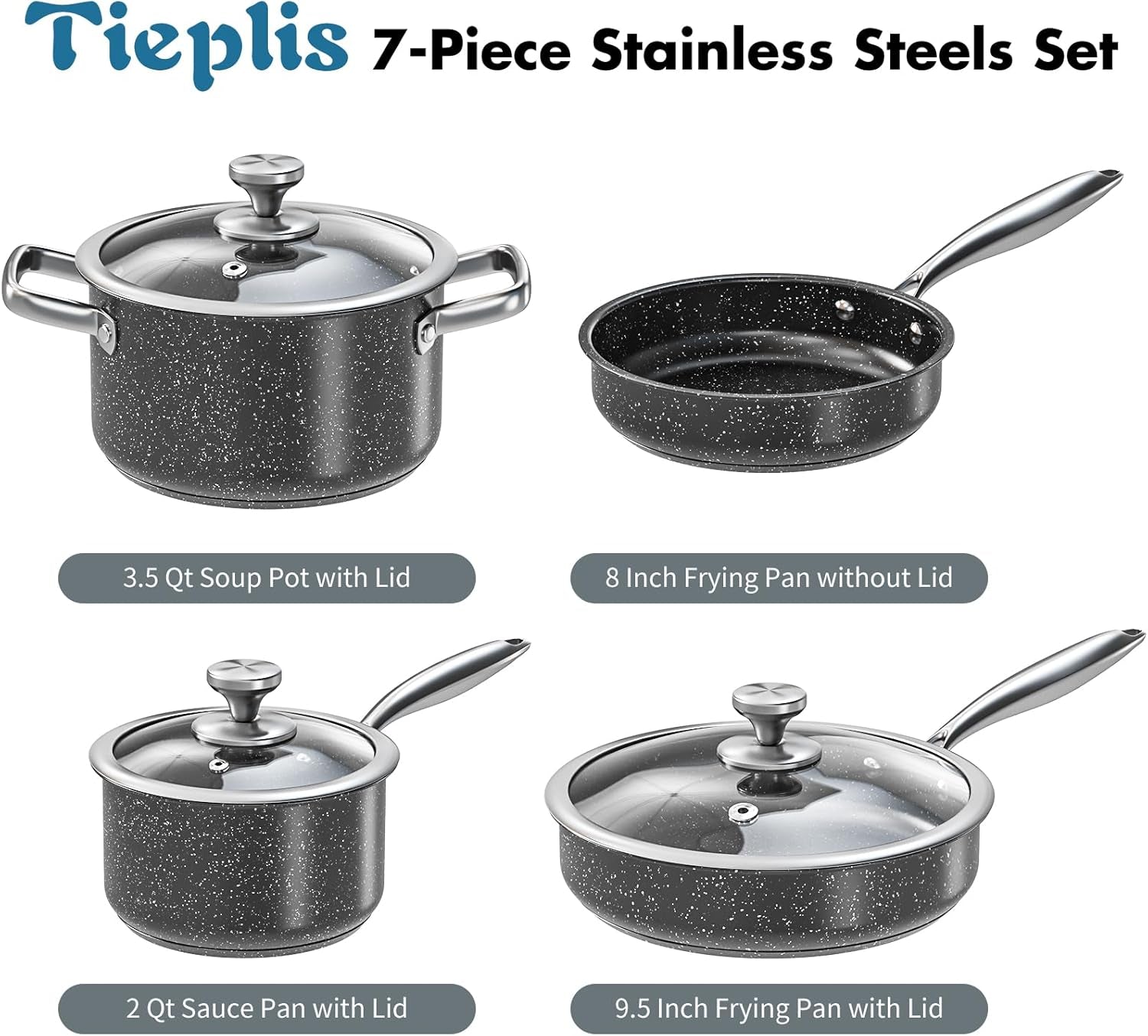 • Attractive & Durable: Each piece is expertly crafted with premium-grade stainless steel for top-notch heat conductivity and distribution. Finished with a glossy granite coating on the interiors and exteriors, these pots and pans are engineered for exceptional durability, ensuring they maintain their sleek appearance even with daily use